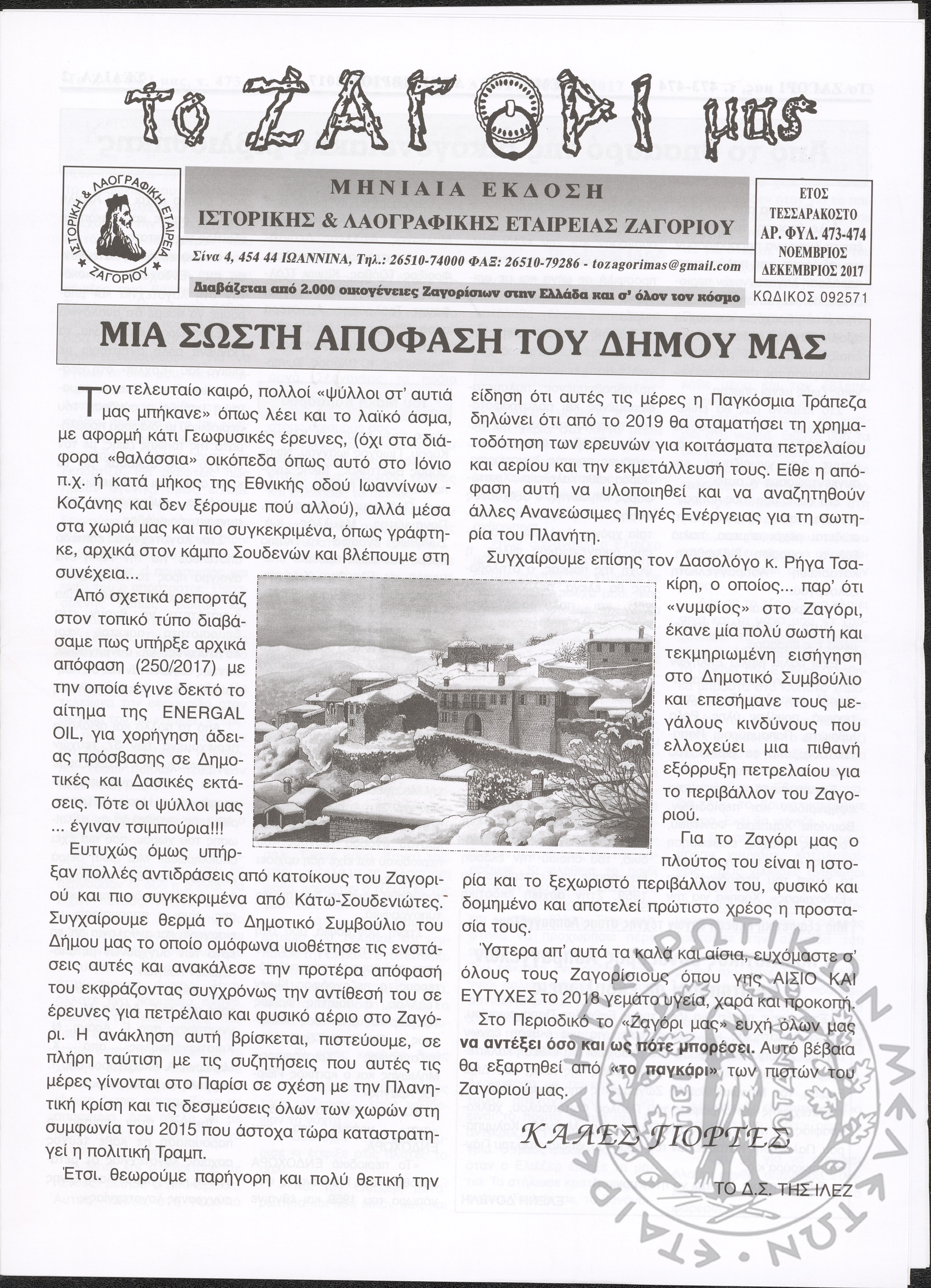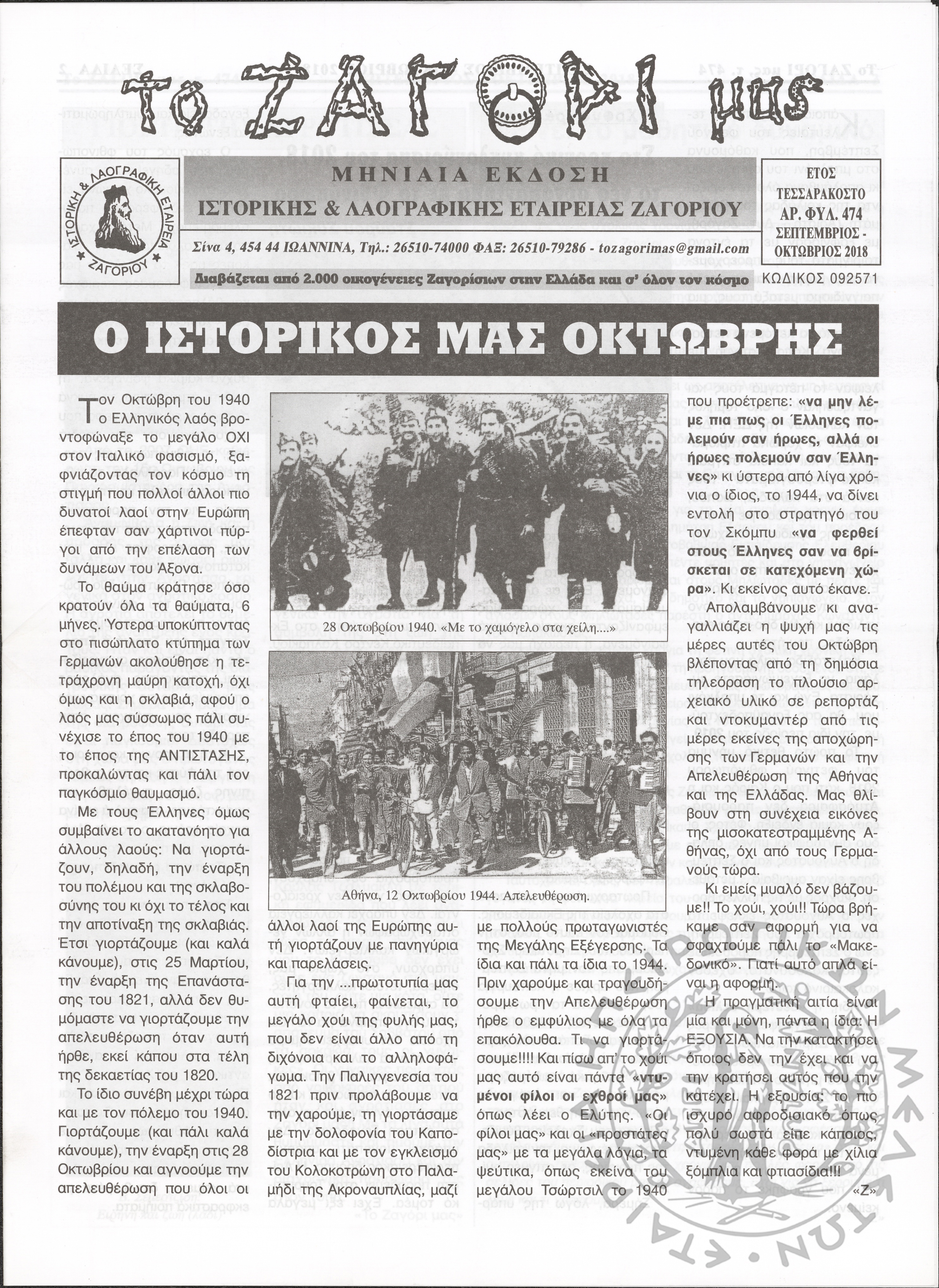 Το Ζαγόρι μας: μηνιαία έκδοση Ιστορικής και Λαογραφικής Εταιρείας Ζαγορίου (φ. 474)Έτος 40o, φ. 474...
