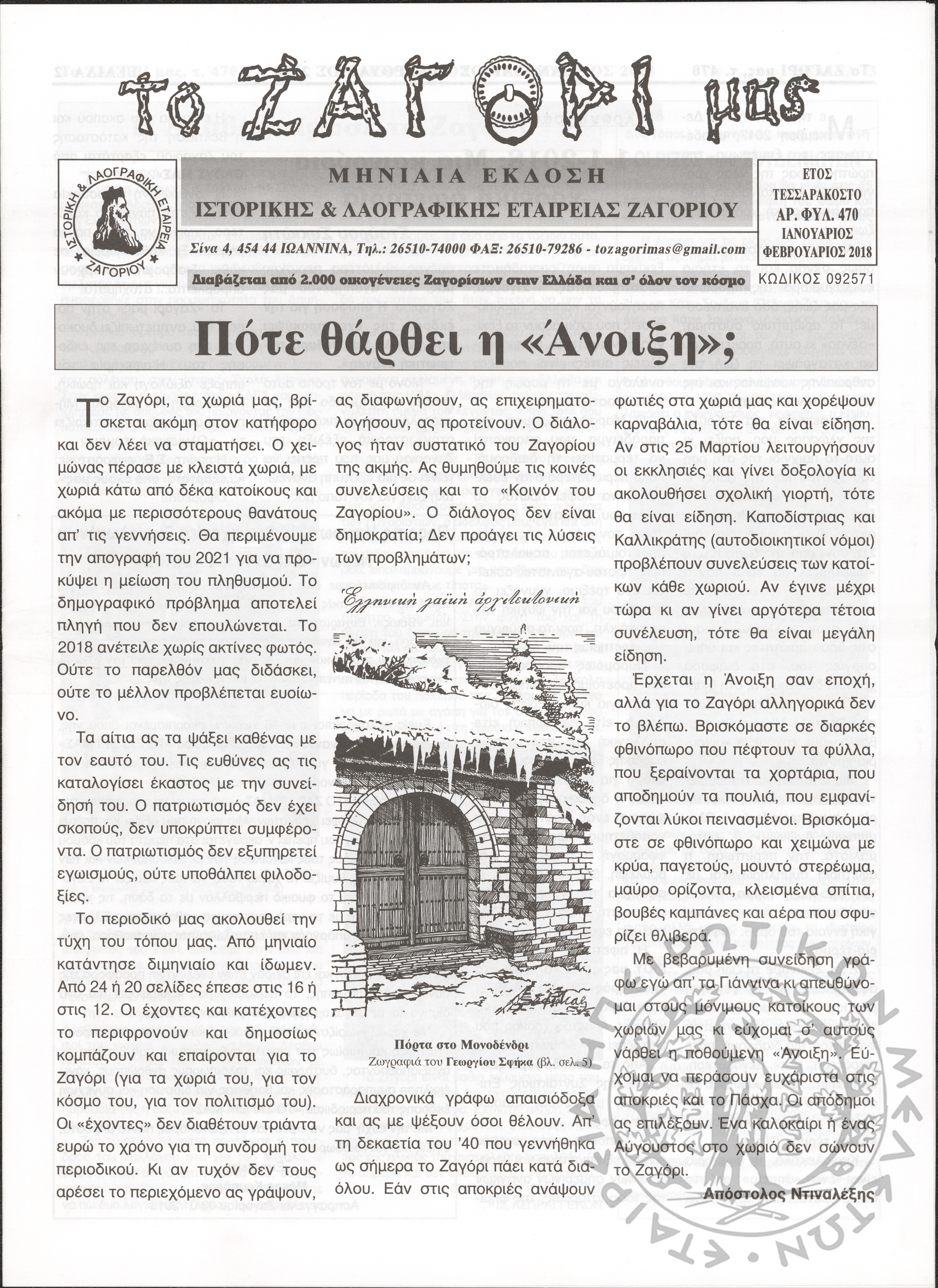 Το Ζαγόρι μας: μηνιαία έκδοση Ιστορικής και Λαογραφικής Εταιρείας Ζαγορίου (φ. 470)Έτος 40o, φ. 470...