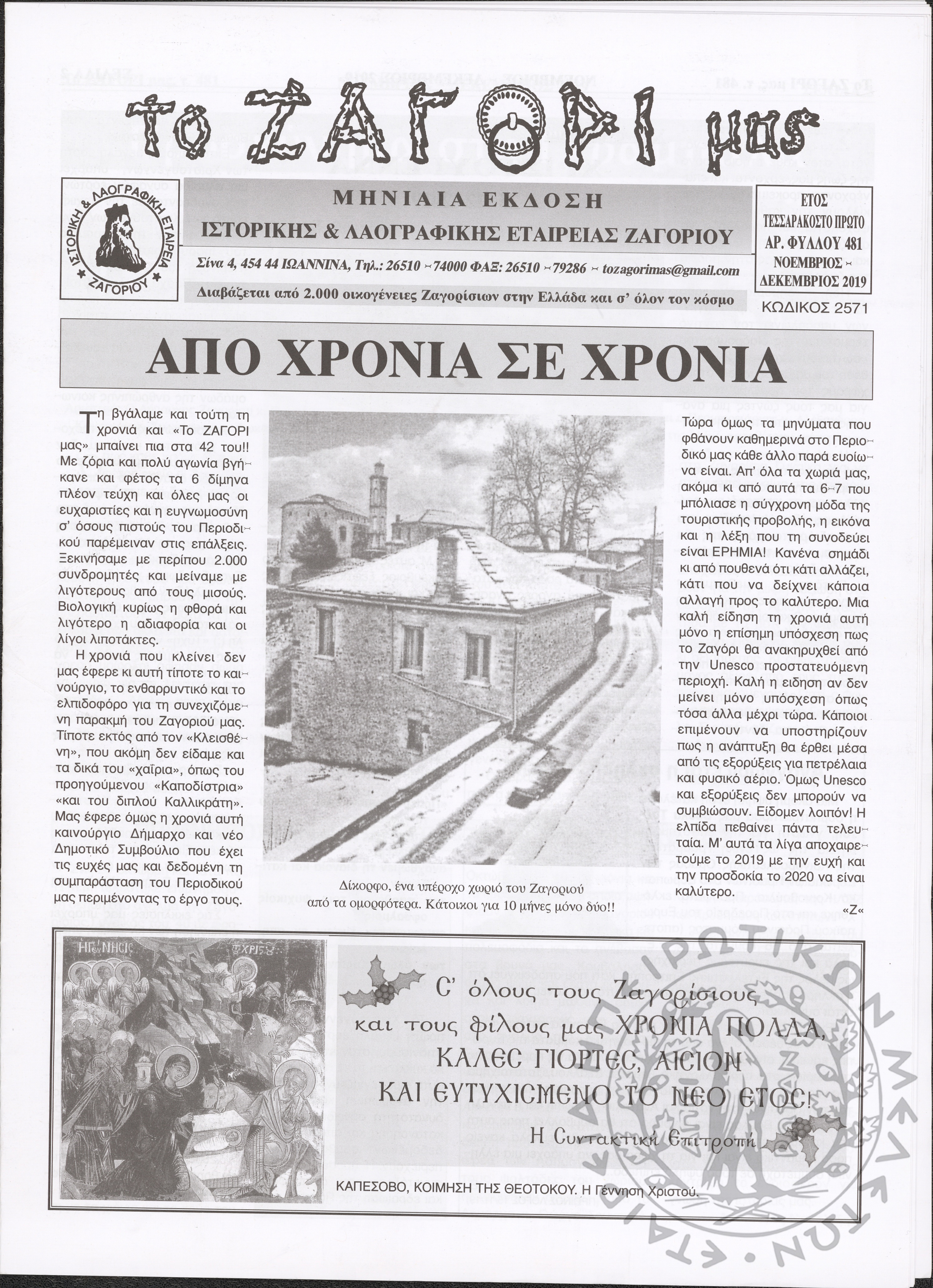 Το Ζαγόρι μας: μηνιαία έκδοση Ιστορικής και Λαογραφικής Εταιρείας Ζαγορίου (φ. 481)Έτος 41o, φ. 481...
