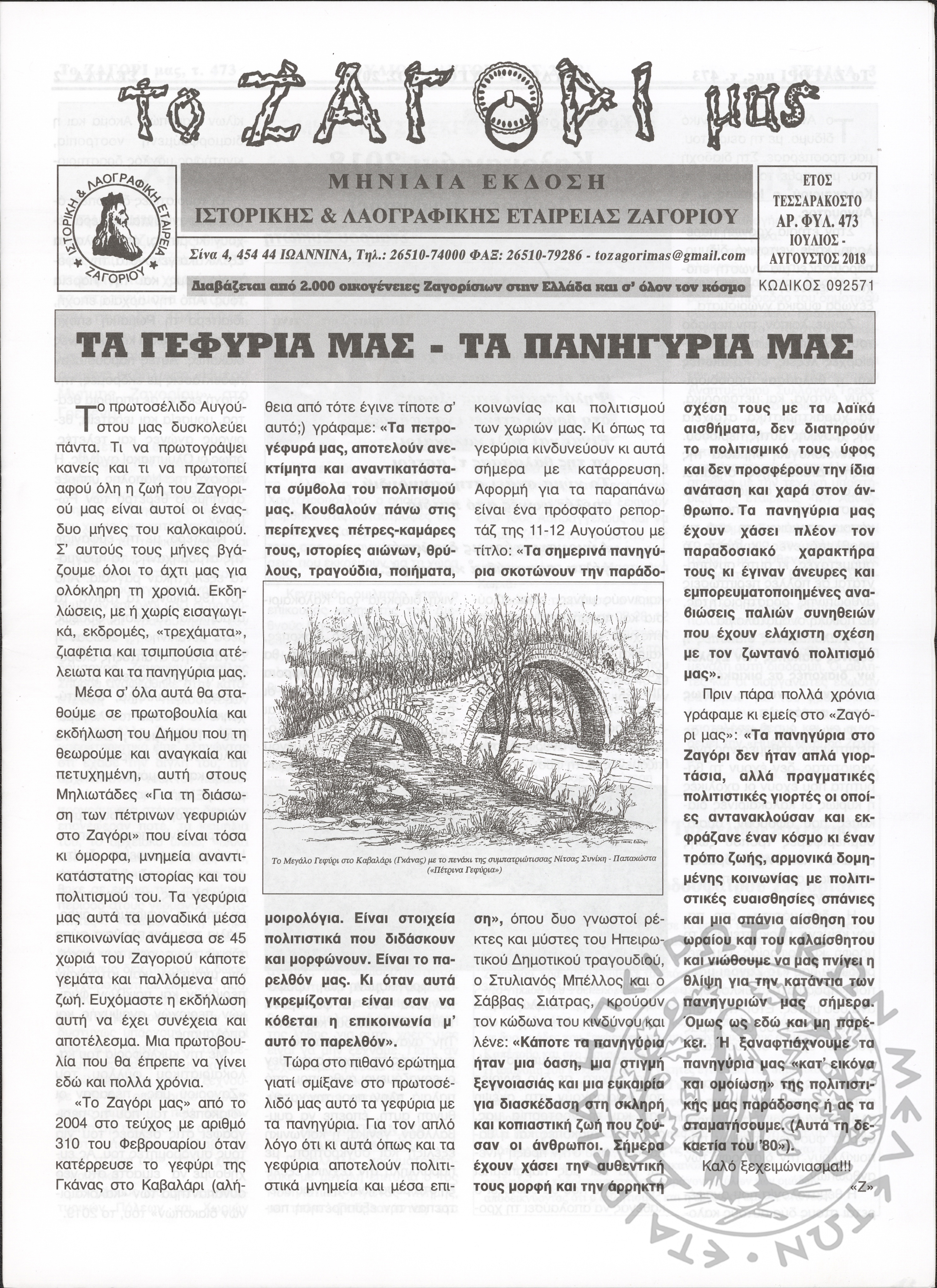 Το Ζαγόρι μας: μηνιαία έκδοση Ιστορικής και Λαογραφικής Εταιρείας Ζαγορίου (φ. 473)Έτος 40o, φ. 473...