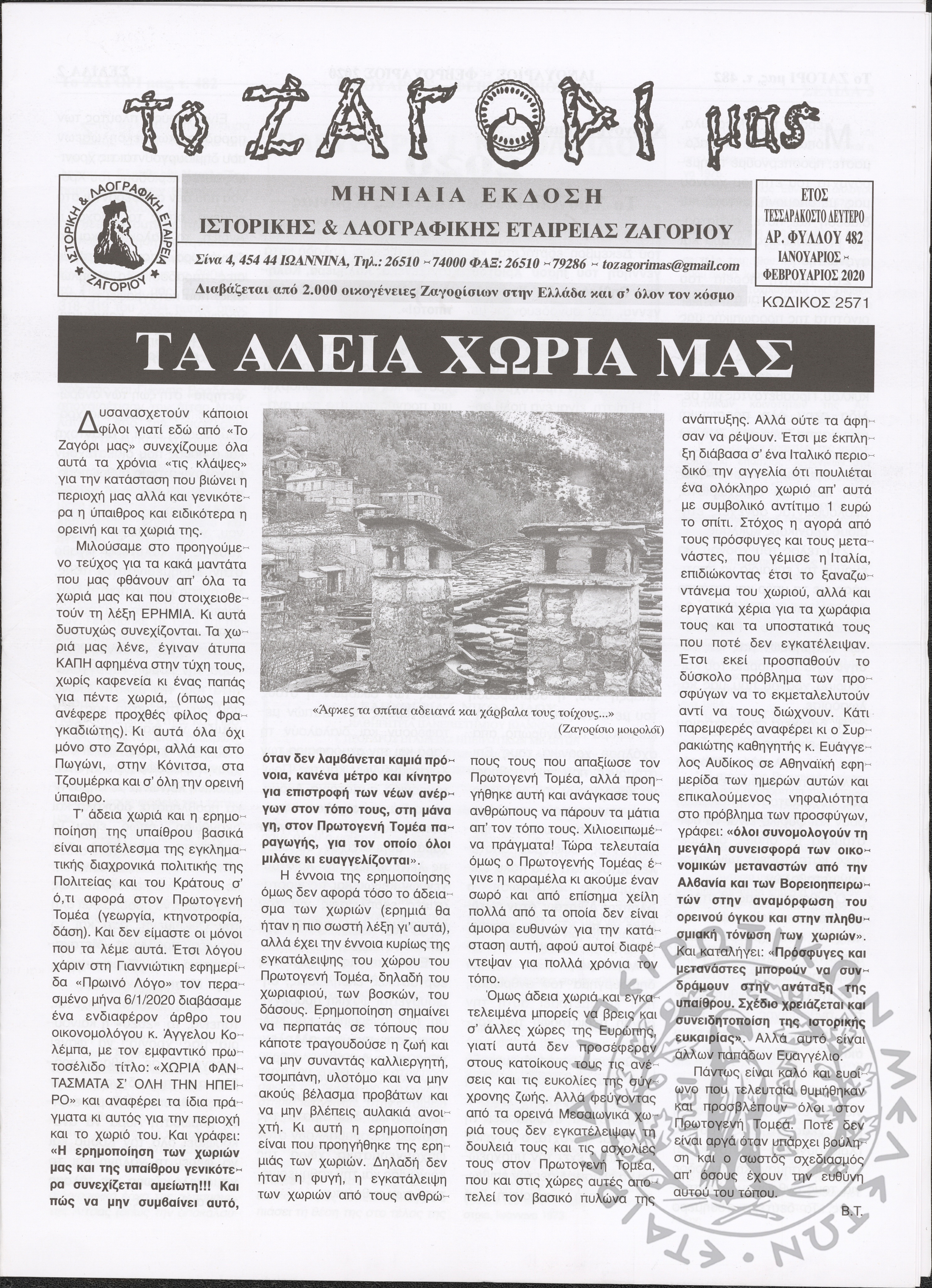 Το Ζαγόρι μας: μηνιαία έκδοση Ιστορικής και Λαογραφικής Εταιρείας Ζαγορίου (φ. 482)Έτος 42o, φ. 482...