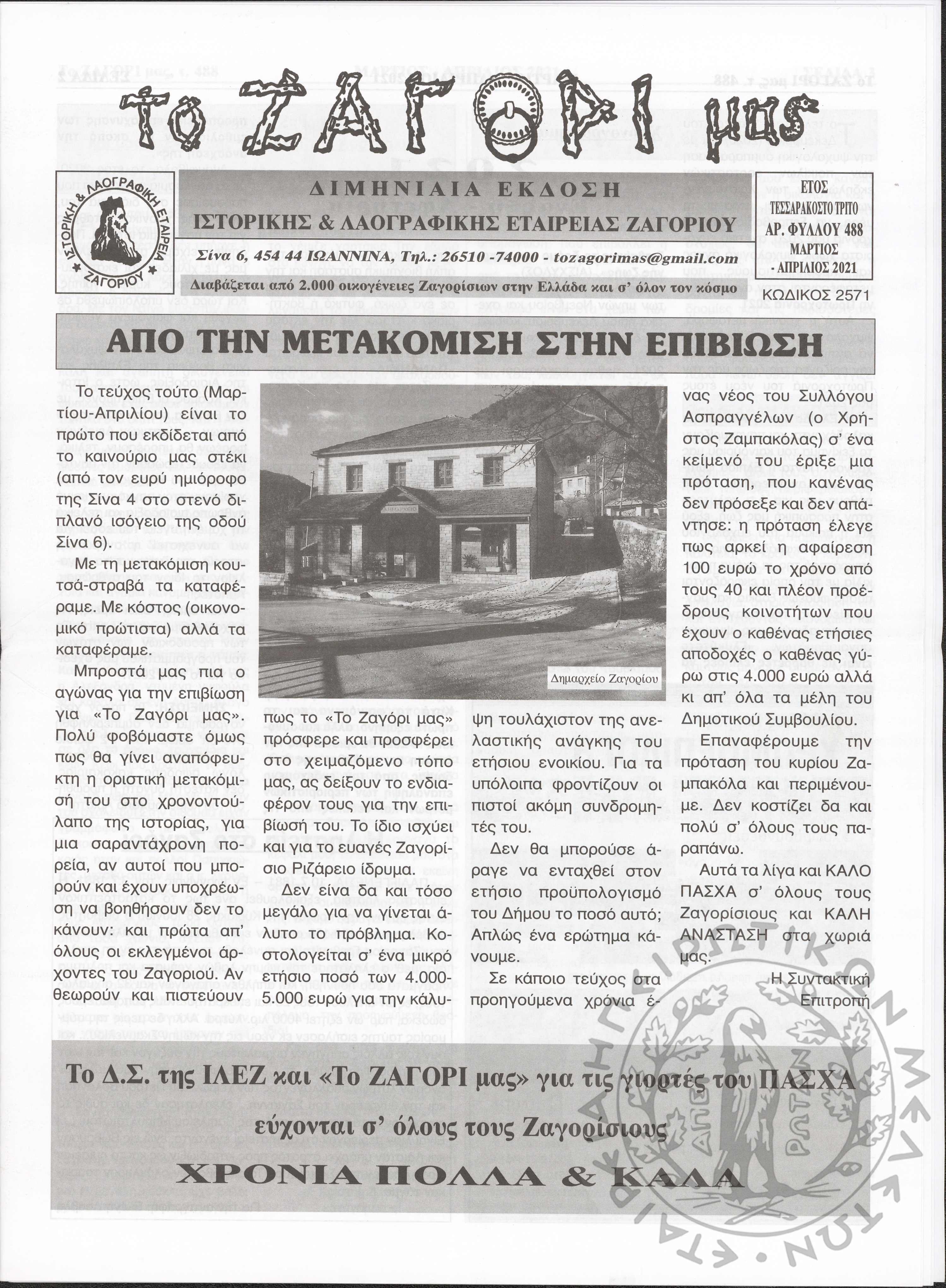 Το Ζαγόρι μας: μηνιαία έκδοση Ιστορικής και Λαογραφικής Εταιρείας Ζαγορίου (φ. 488)Έτος 43o, φ. 488...