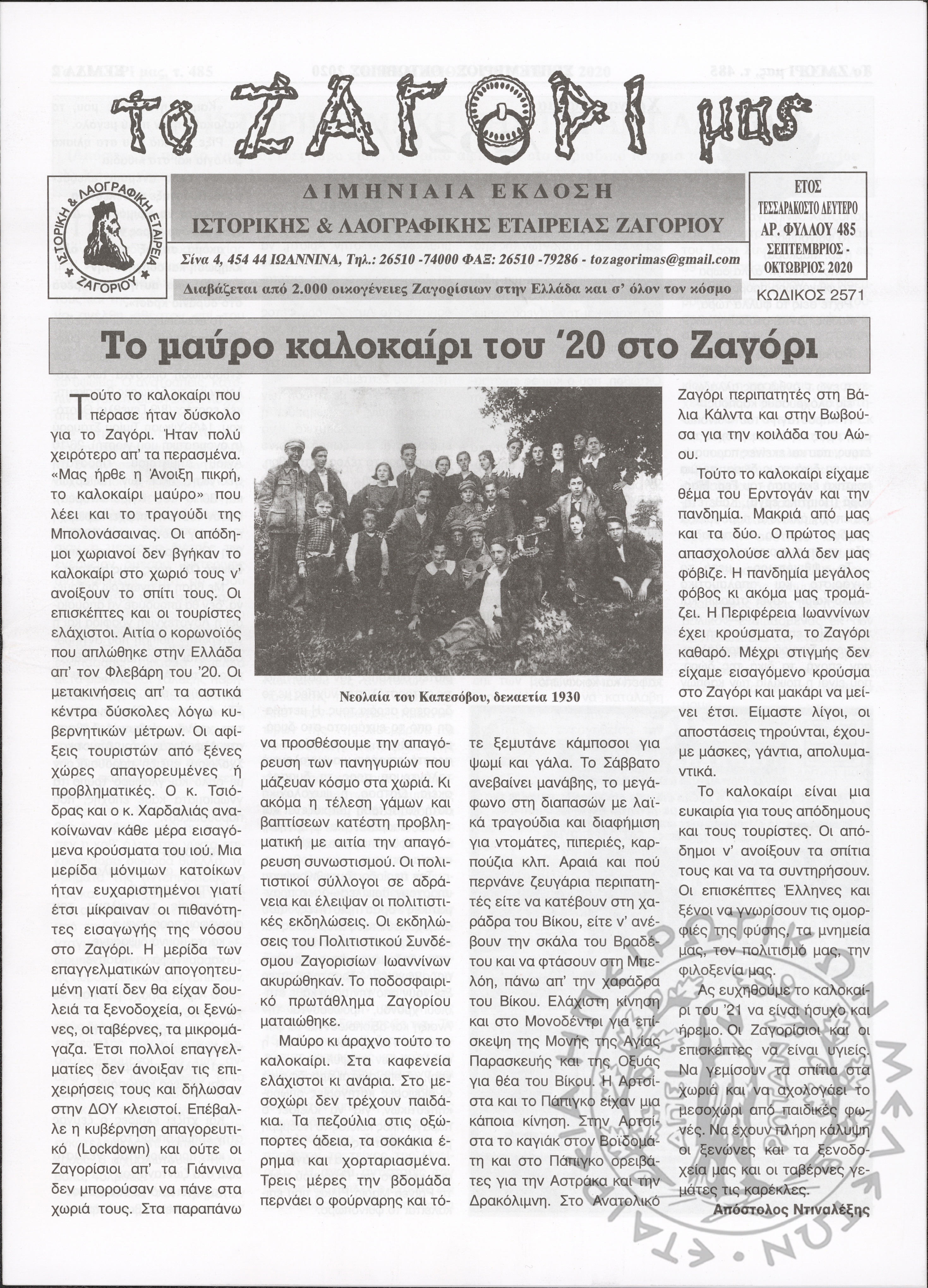 Το Ζαγόρι μας: μηνιαία έκδοση Ιστορικής και Λαογραφικής Εταιρείας Ζαγορίου (φ. 485)Έτος 42o, φ. 485...