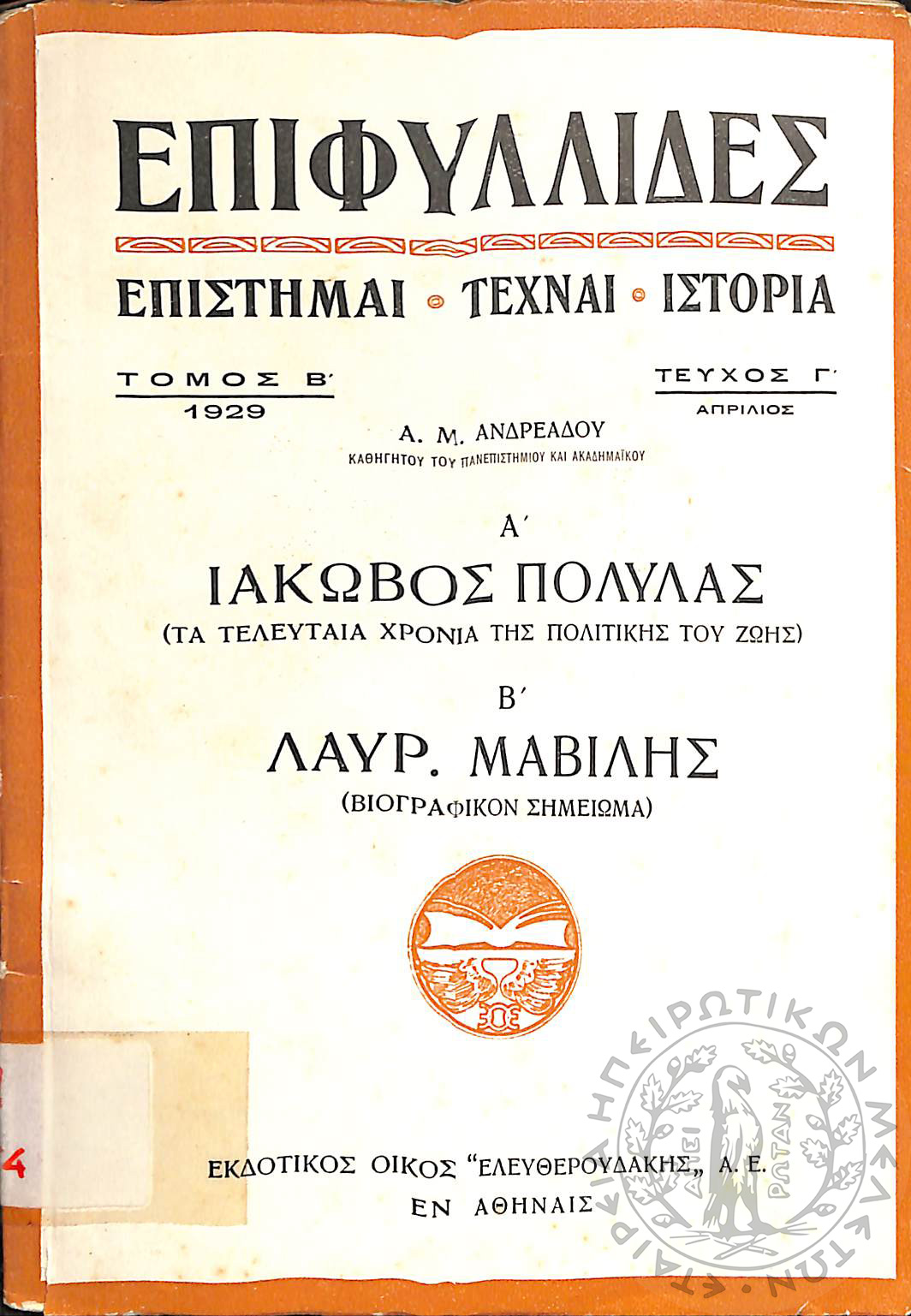 Επιφυλλίδες: επιστήμαι, τέχναι, ιστορία (τεύχ. 3: Α΄. Ιάκωβος Πολυλάς - Β΄. Λαυρ. Μαβίλης)Τόμ. Β΄, τεύχ. Γ΄...