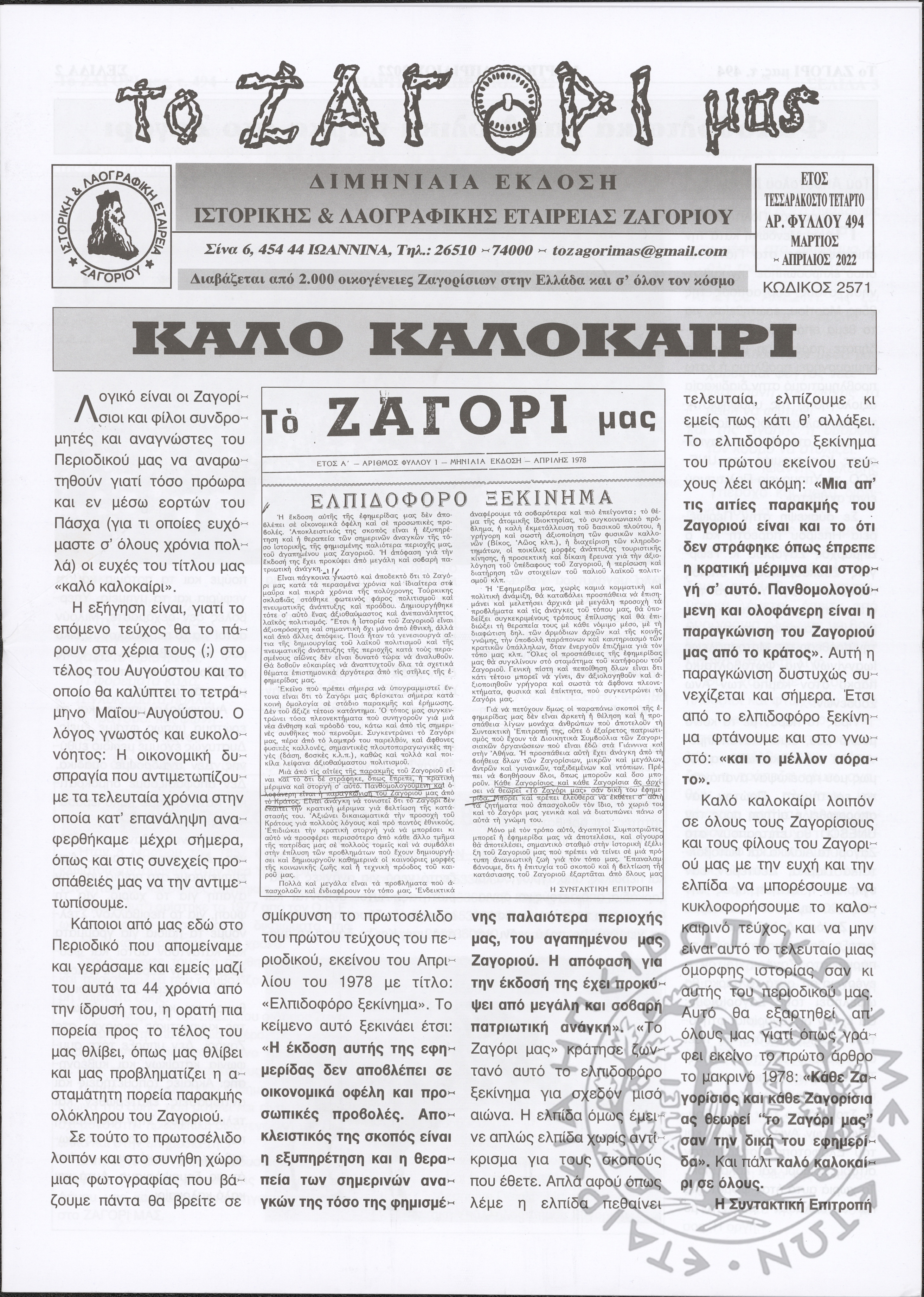 Το Ζαγόρι μας: μηνιαία έκδοση Ιστορικής και Λαογραφικής Εταιρείας Ζαγορίου (φ. 494)Έτος 44o, φ. 494...
