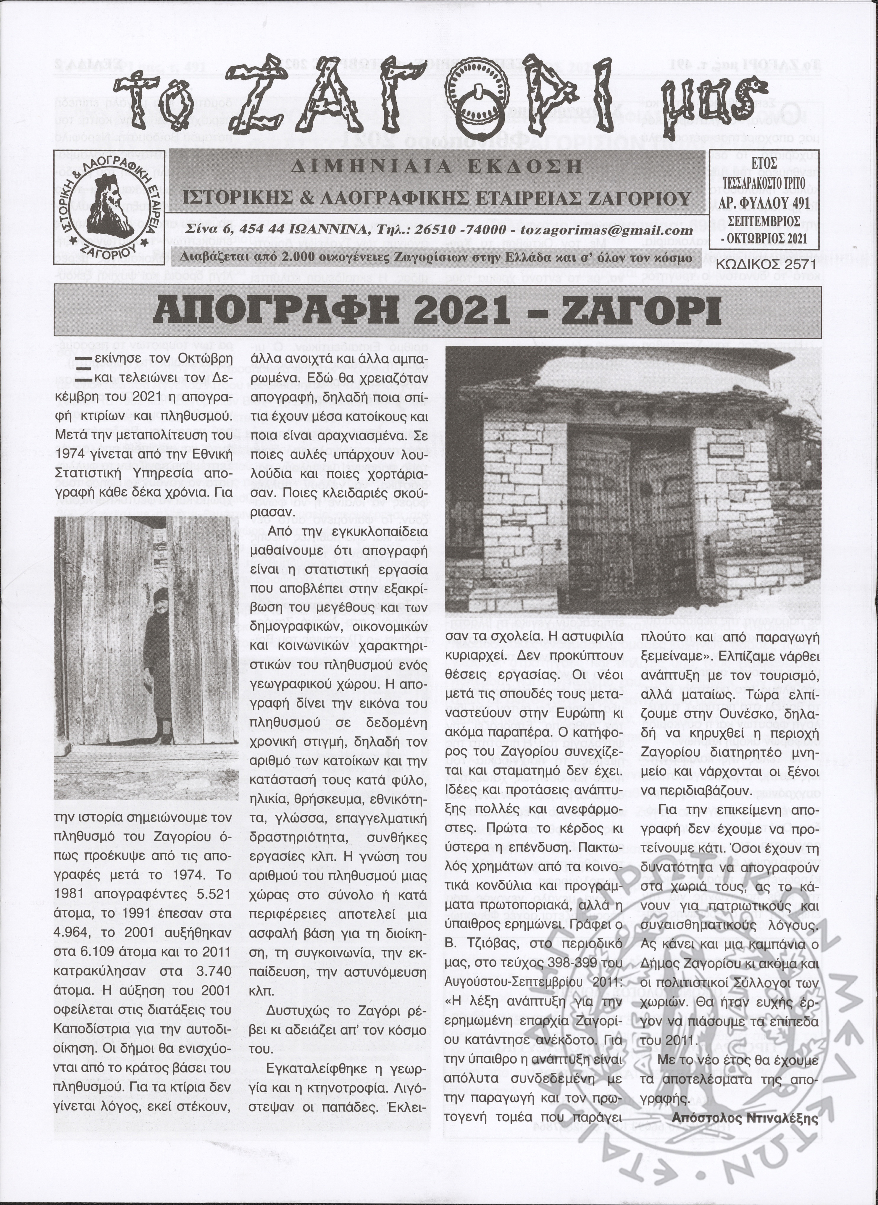 Το Ζαγόρι μας: μηνιαία έκδοση Ιστορικής και Λαογραφικής Εταιρείας Ζαγορίου (φ. 491)Έτος 43o, φ. 491...