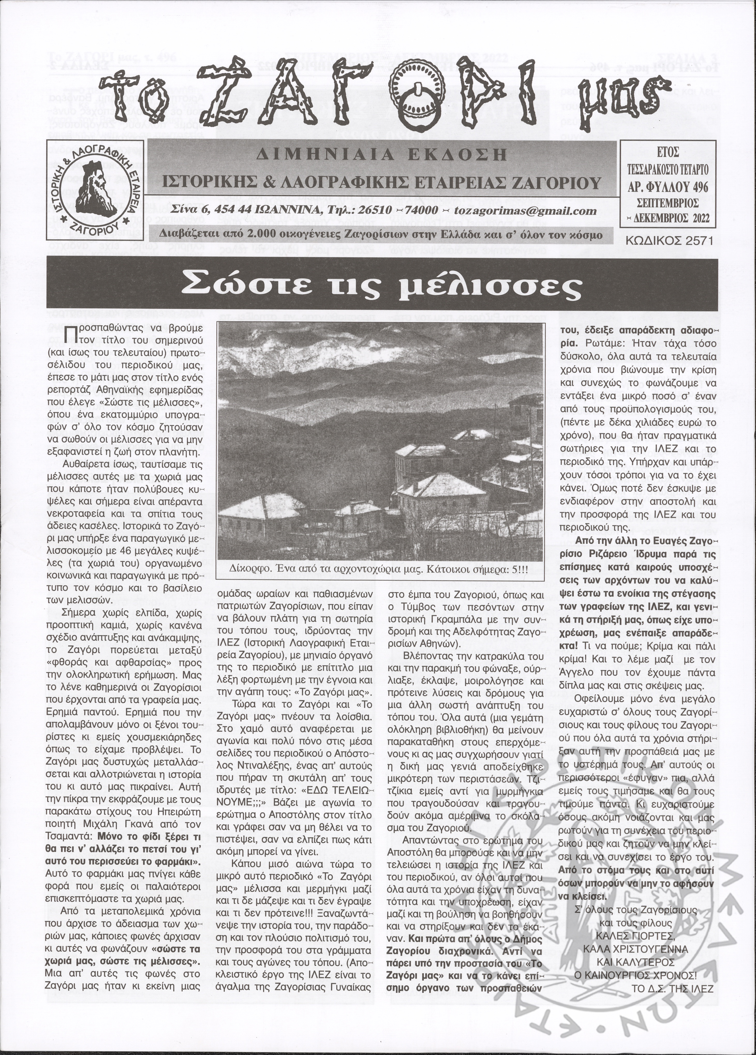 Το Ζαγόρι μας: μηνιαία έκδοση Ιστορικής και Λαογραφικής Εταιρείας Ζαγορίου (φ. 496)Έτος 44o, φ. 496...