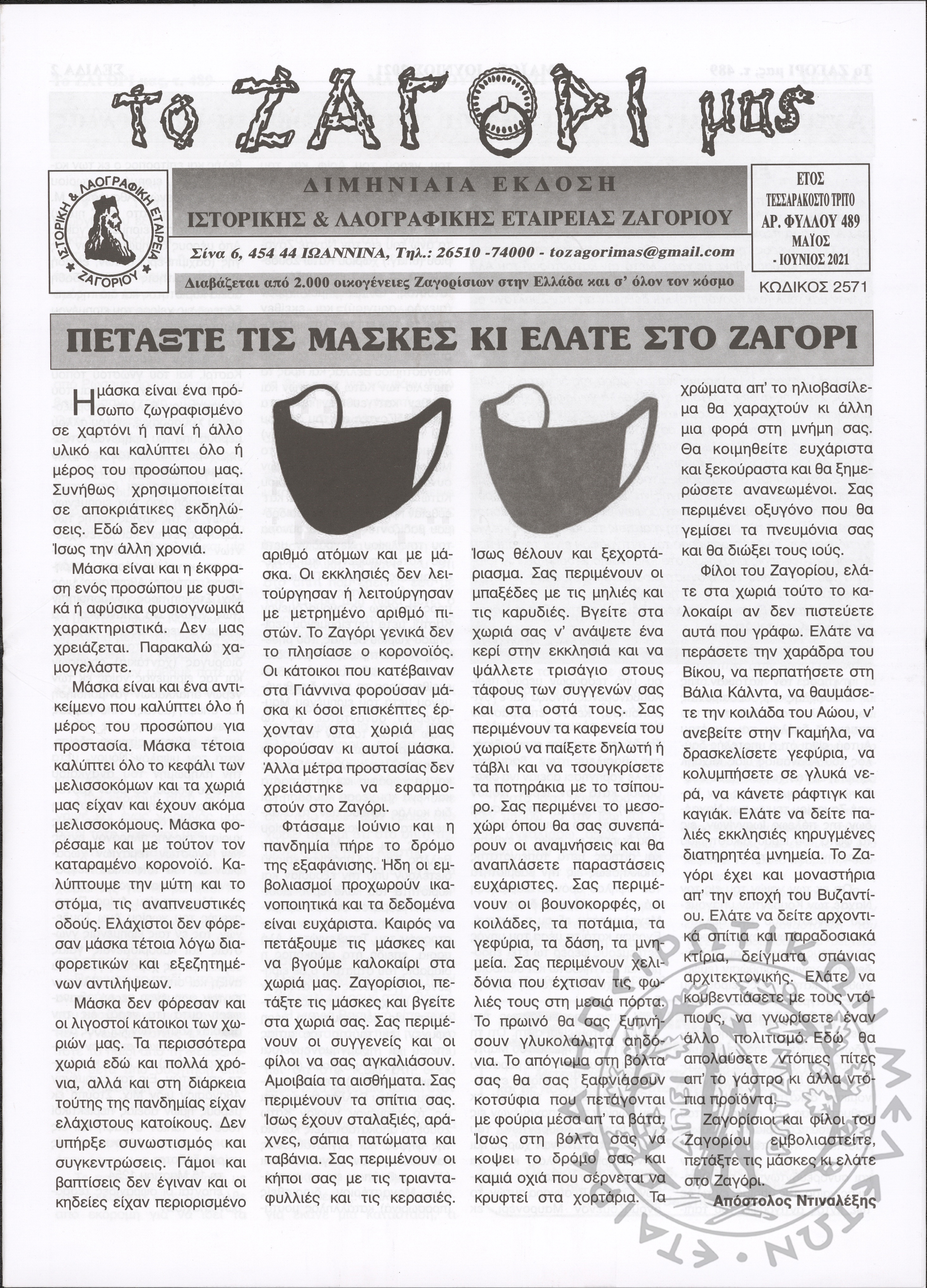 Το Ζαγόρι μας: μηνιαία έκδοση Ιστορικής και Λαογραφικής Εταιρείας Ζαγορίου (φ. 489)Έτος 43o, φ. 489...
