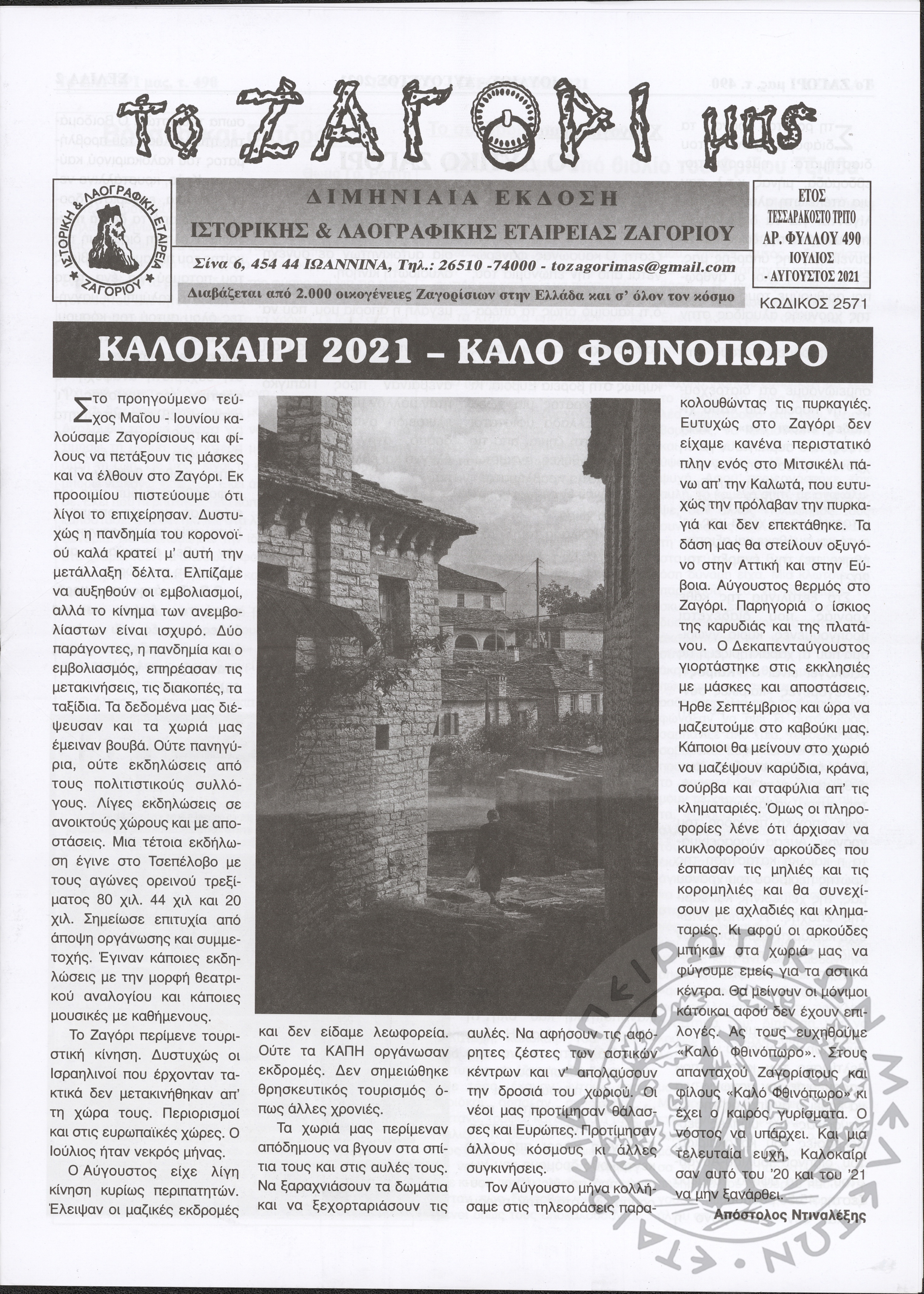 Το Ζαγόρι μας: μηνιαία έκδοση Ιστορικής και Λαογραφικής Εταιρείας Ζαγορίου (φ. 490)Έτος 43o, φ. 490...