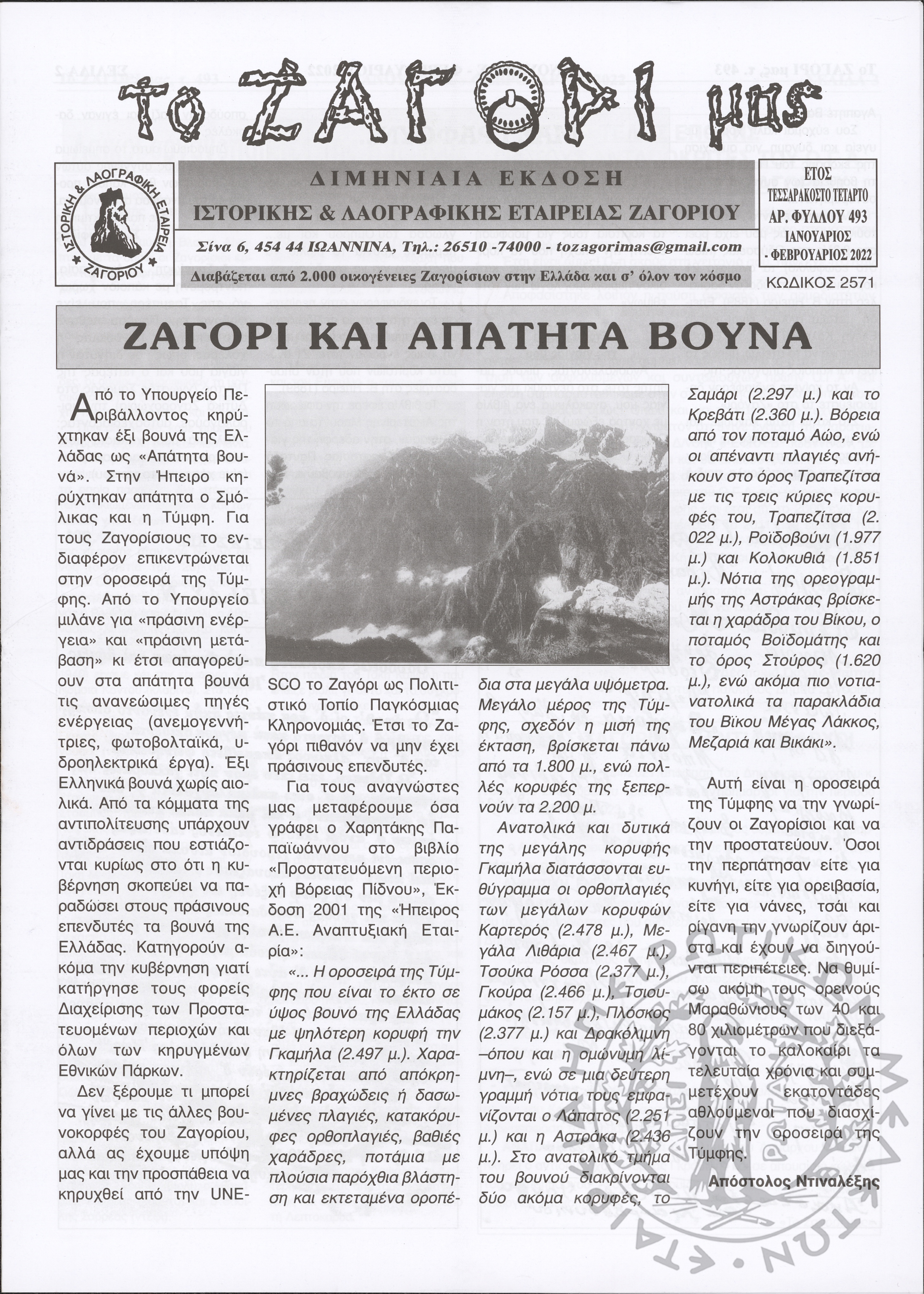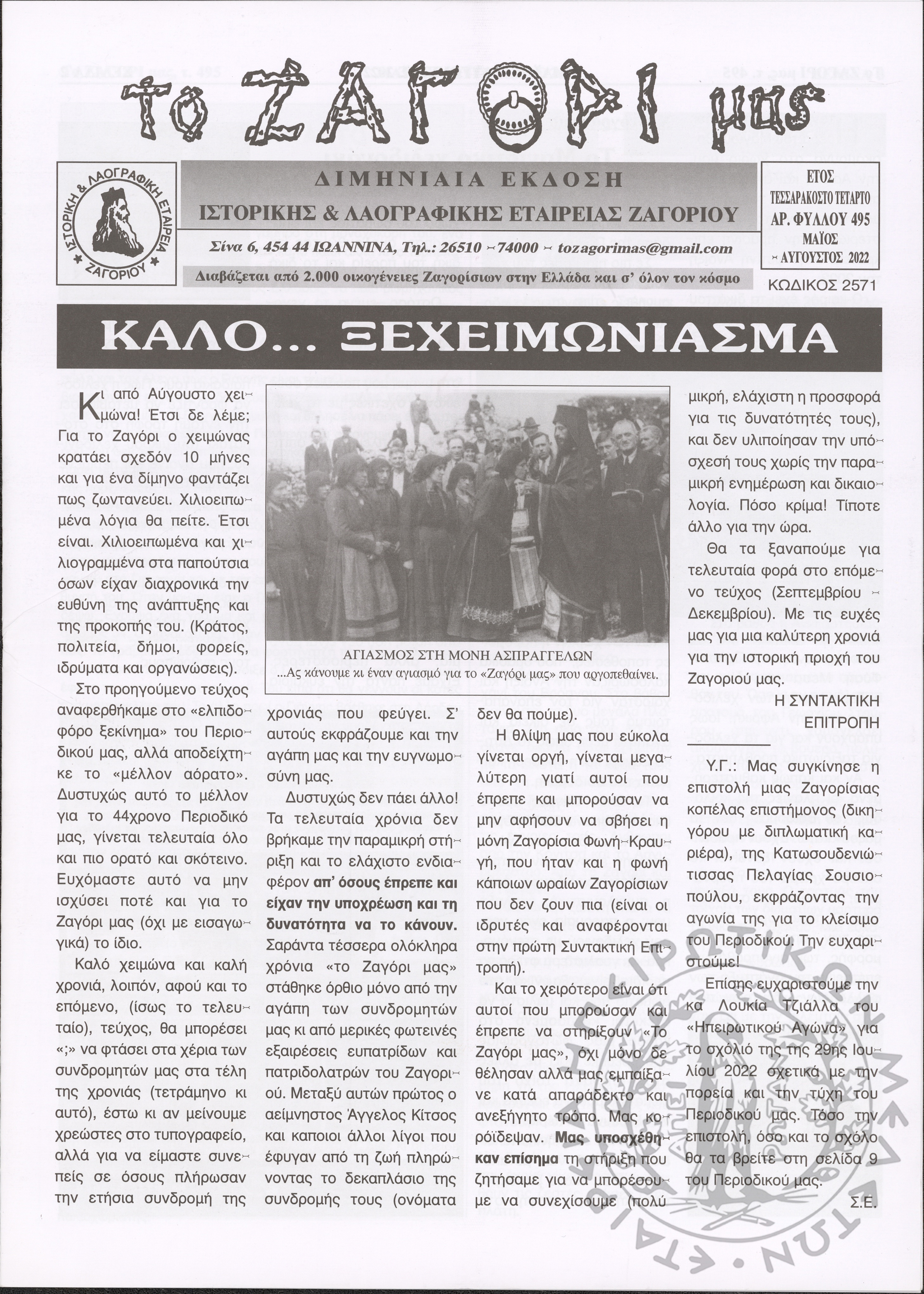 Το Ζαγόρι μας: μηνιαία έκδοση Ιστορικής και Λαογραφικής Εταιρείας Ζαγορίου (φ. 493)Έτος 44o, φ. 493...