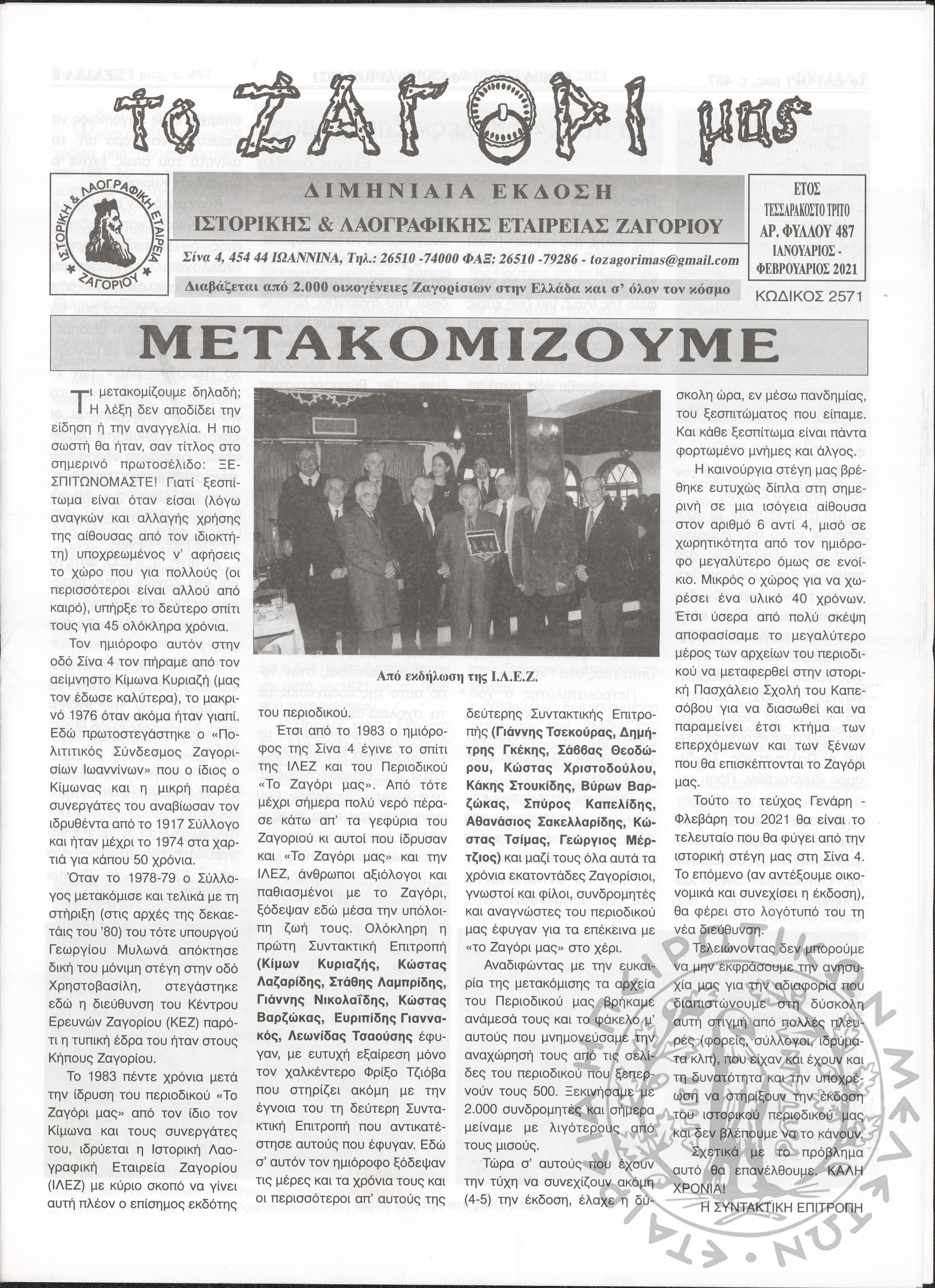 Το Ζαγόρι μας: μηνιαία έκδοση Ιστορικής και Λαογραφικής Εταιρείας Ζαγορίου (φ. 487)Έτος 43o, φ. 487...