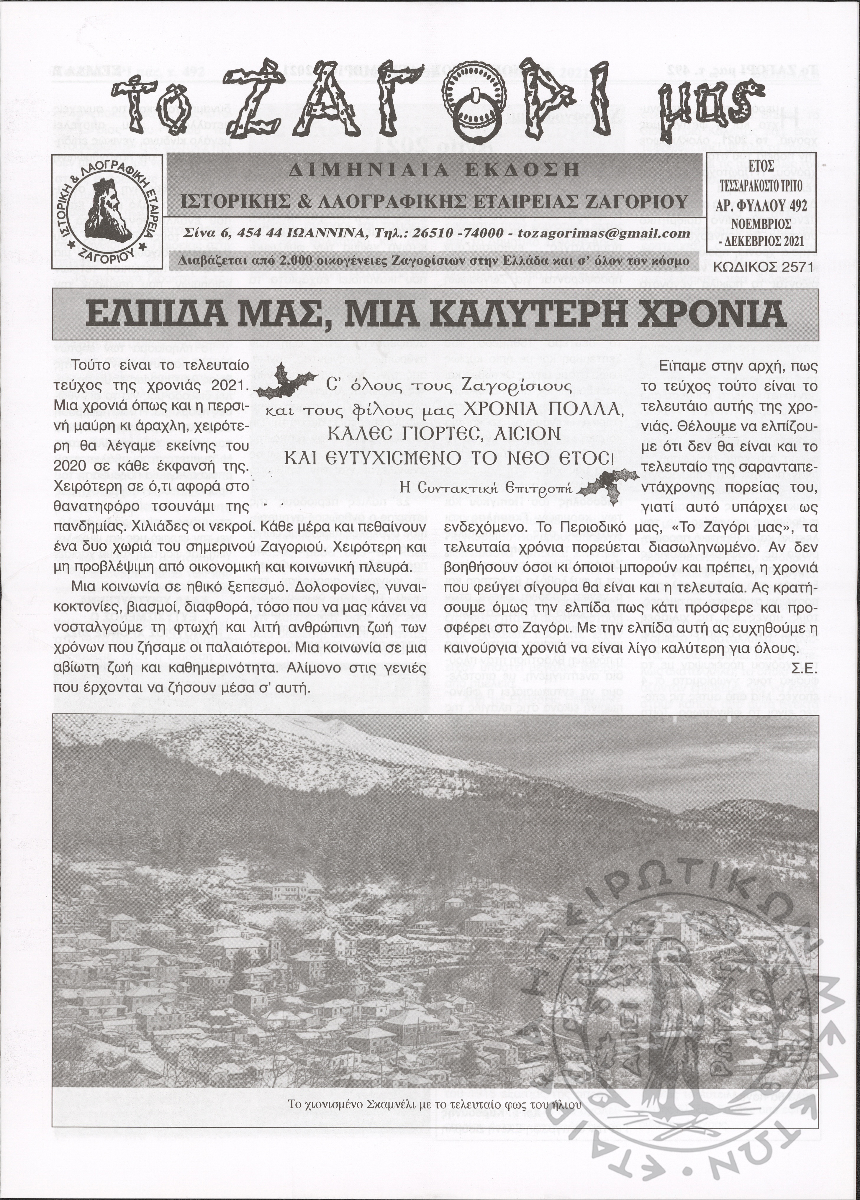 Το Ζαγόρι μας: μηνιαία έκδοση Ιστορικής και Λαογραφικής Εταιρείας Ζαγορίου (φ. 492)Έτος 43o, φ. 492...