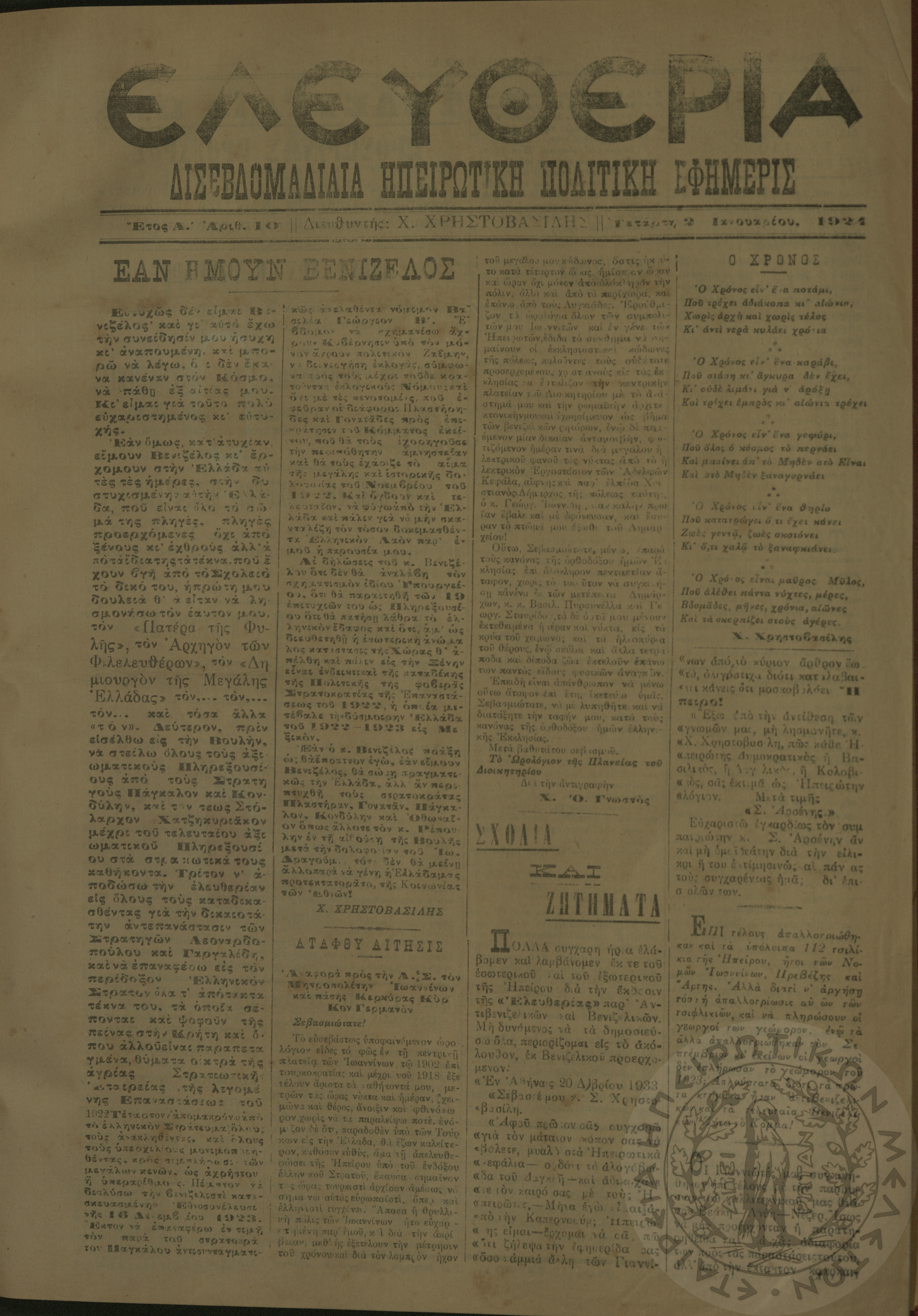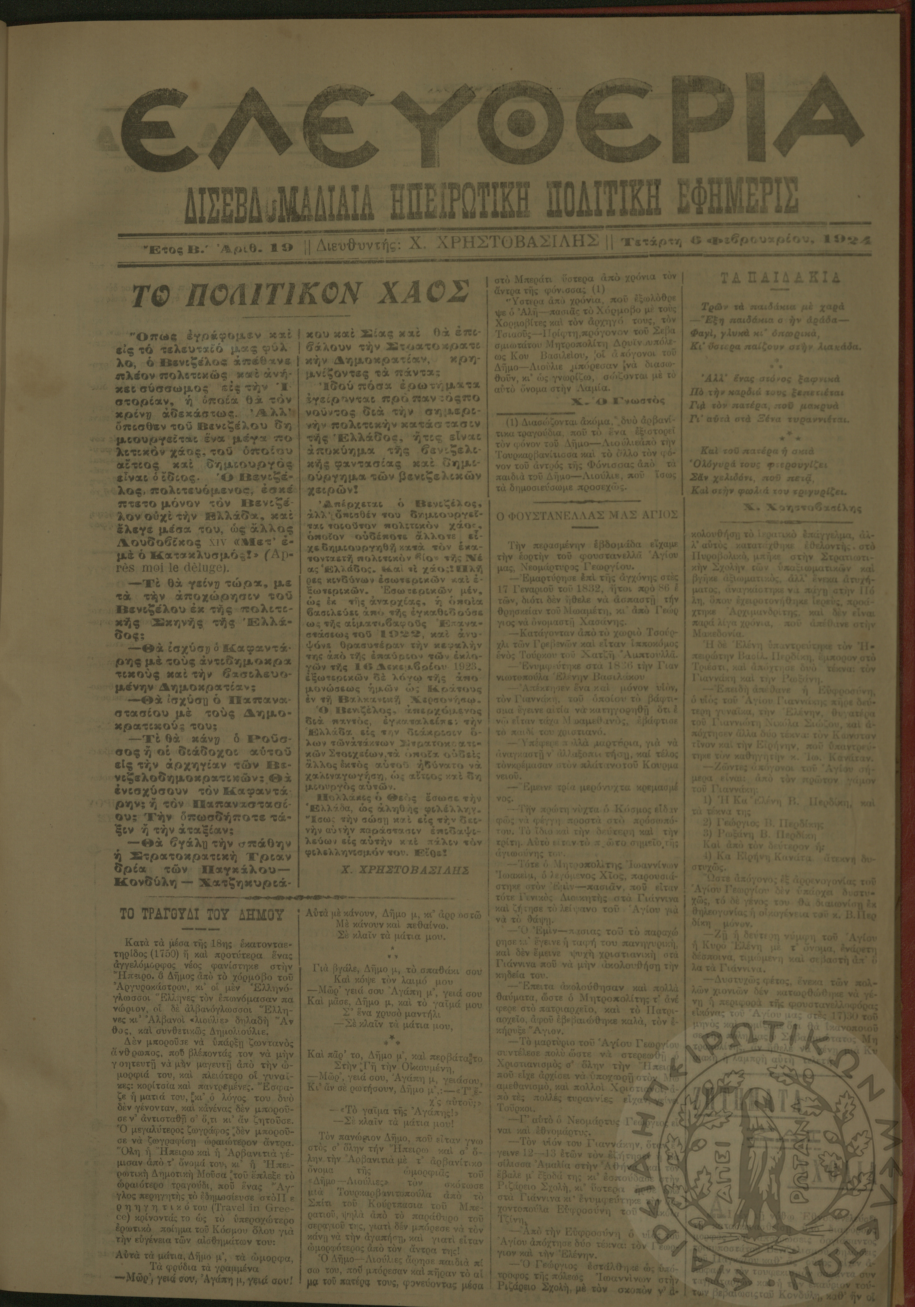 Ελευθερία: δισεβδομαδιαία Ηπειρωτική πολιτική εφημερίς, 1924, φ. 19