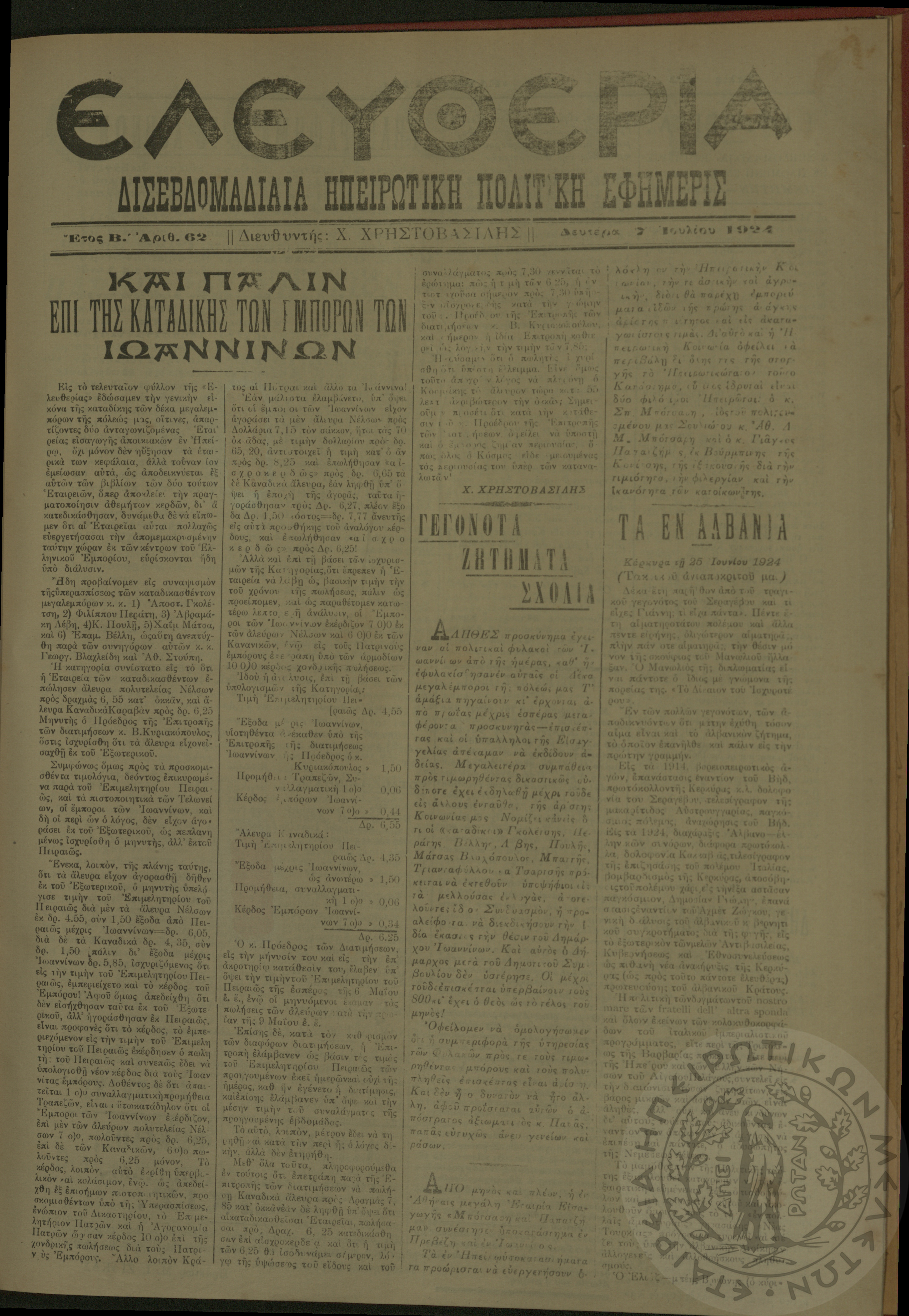 Ελευθερία: δισεβδομαδιαία Ηπειρωτική πολιτική εφημερίς, 1924, φ. 62