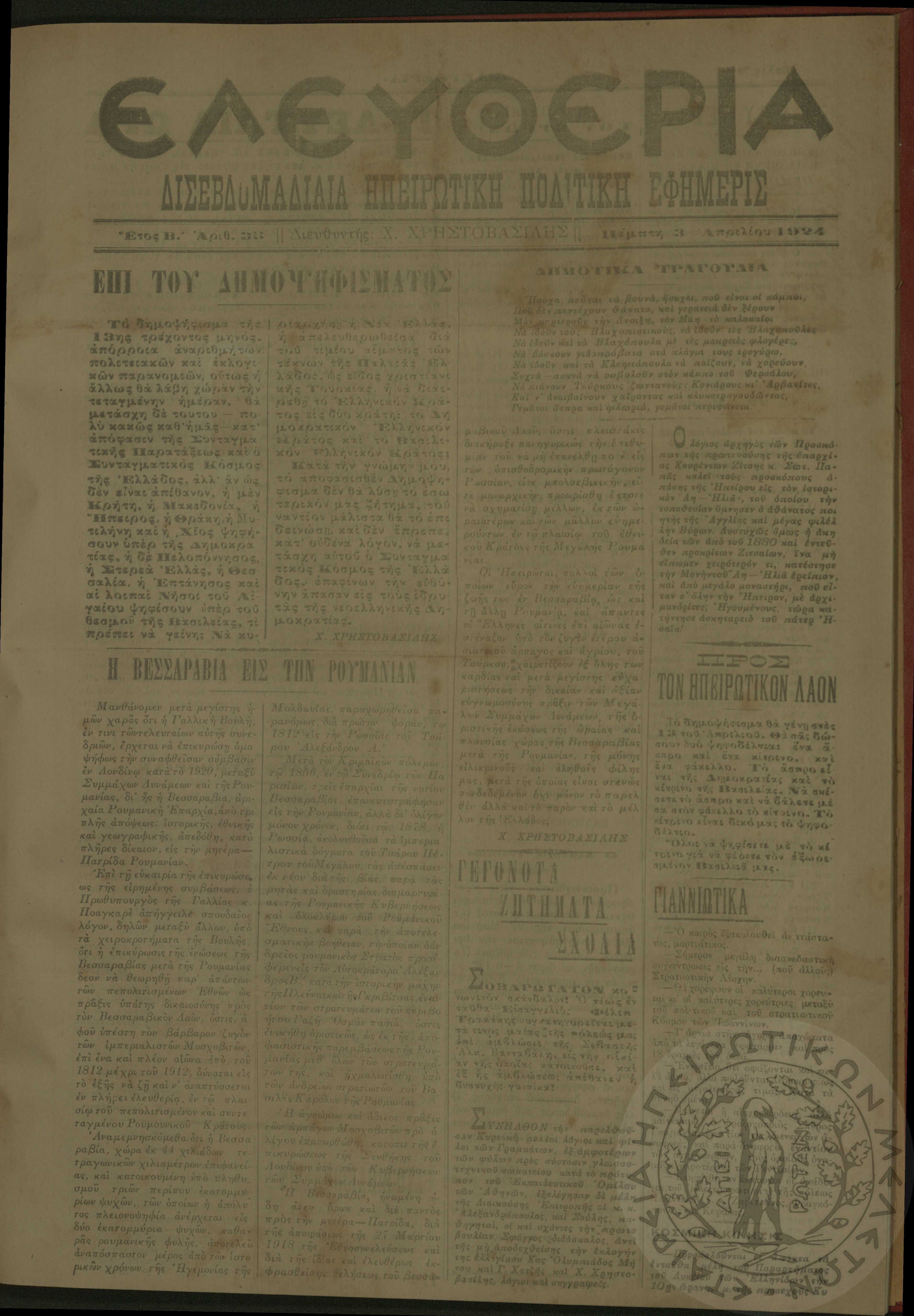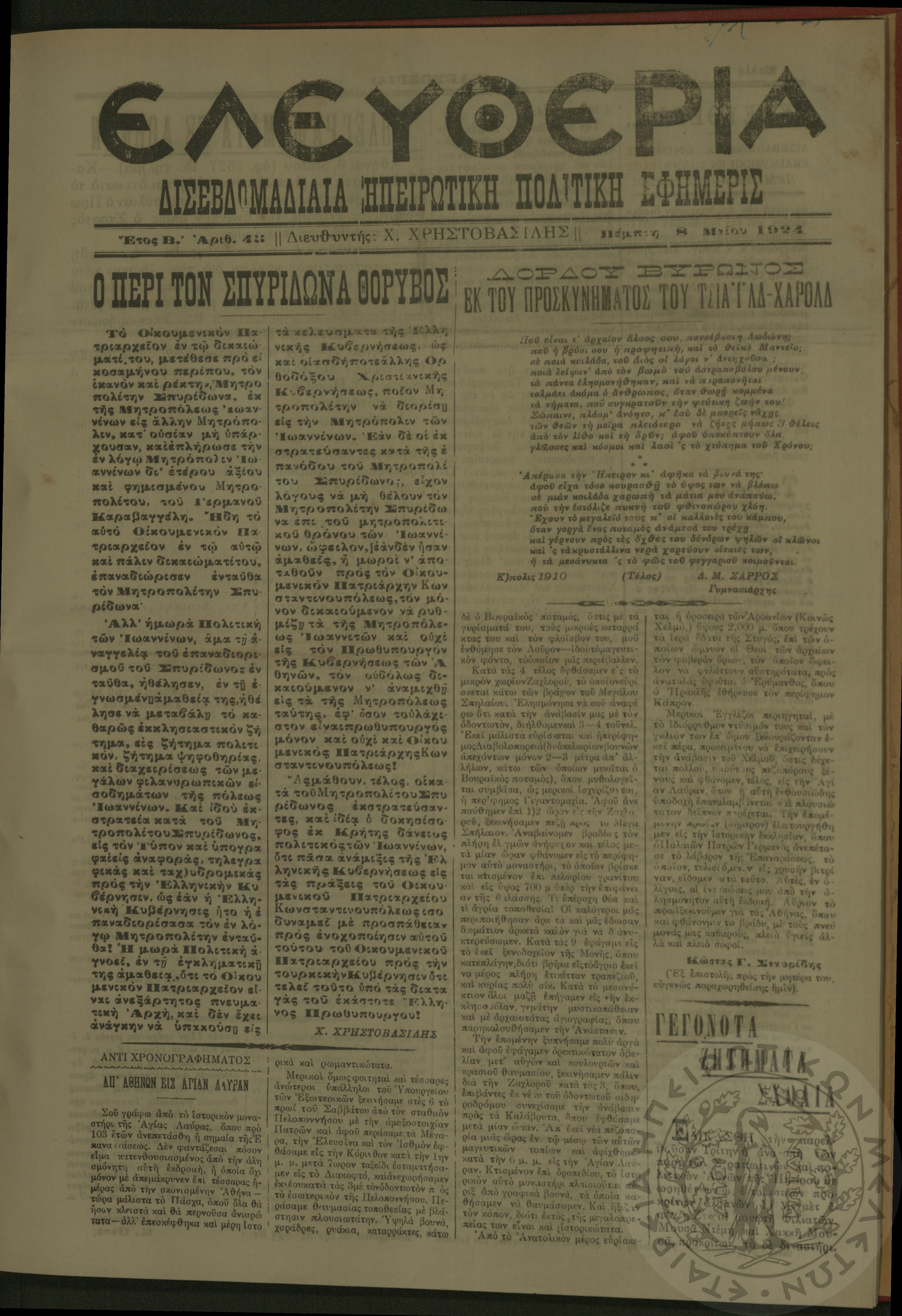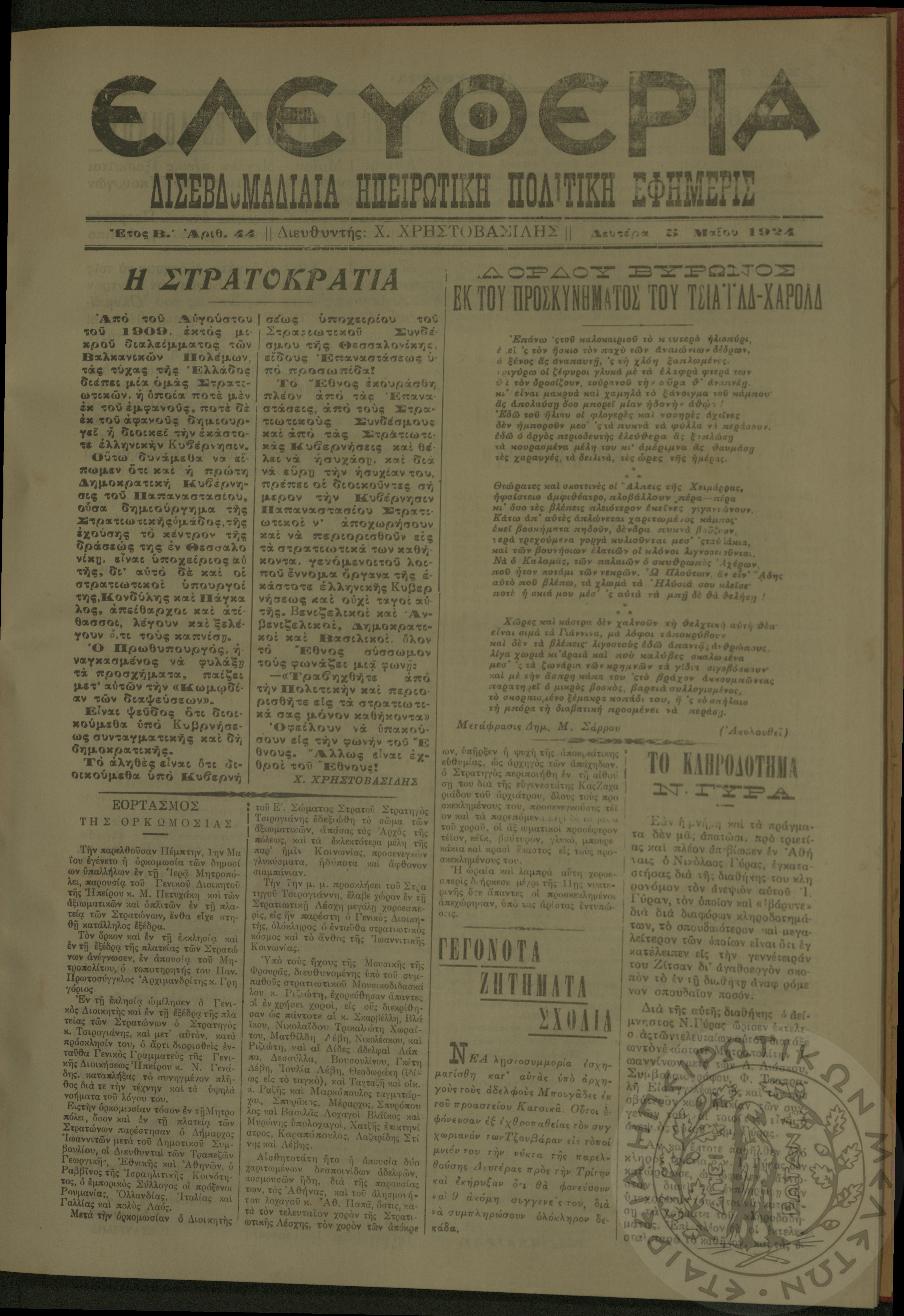 Ελευθερία: δισεβδομαδιαία Ηπειρωτική πολιτική εφημερίς, 1924, φ. 44