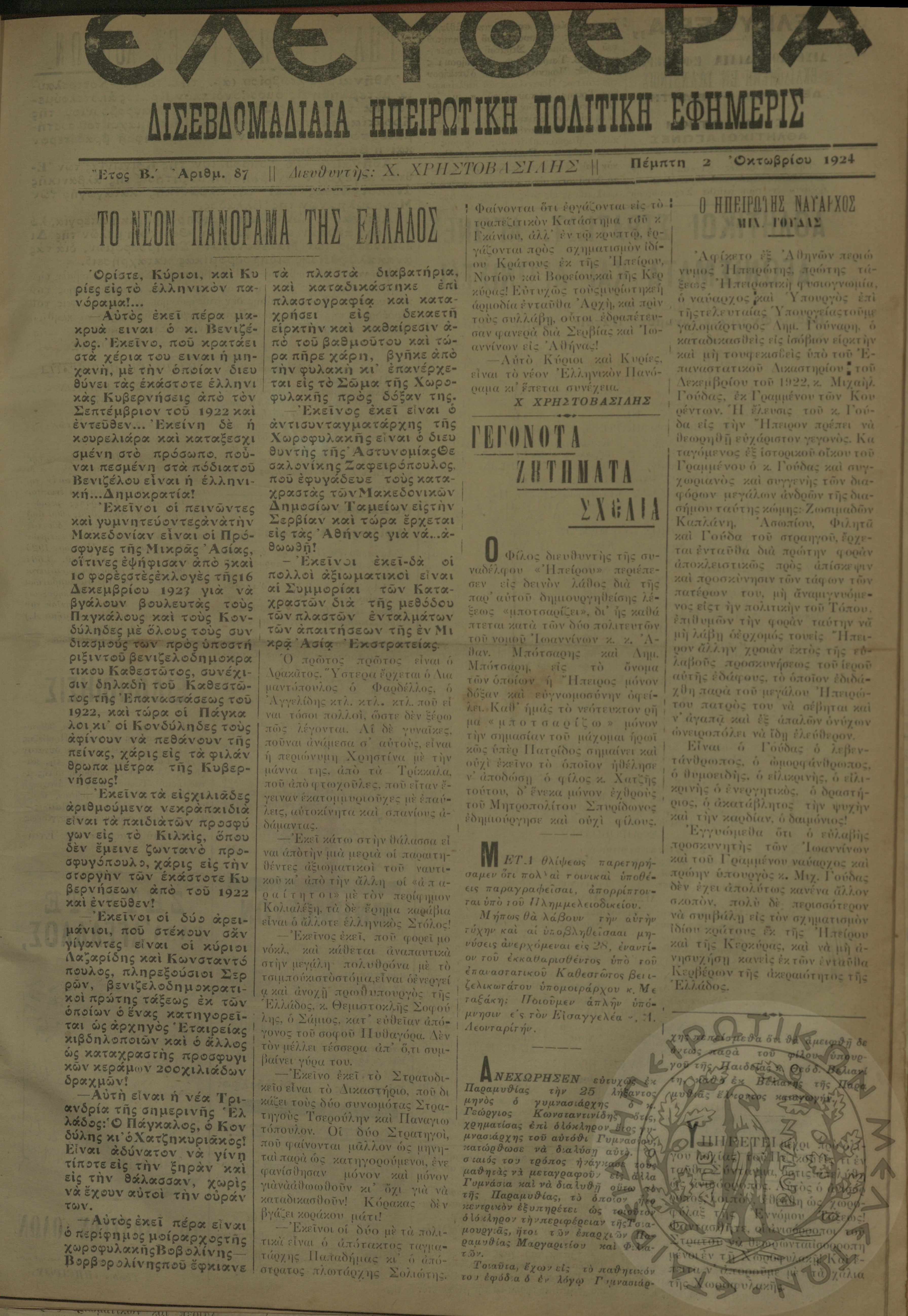 Ελευθερία: δισεβδομαδιαία Ηπειρωτική πολιτική εφημερίς, 1924, φ. 87