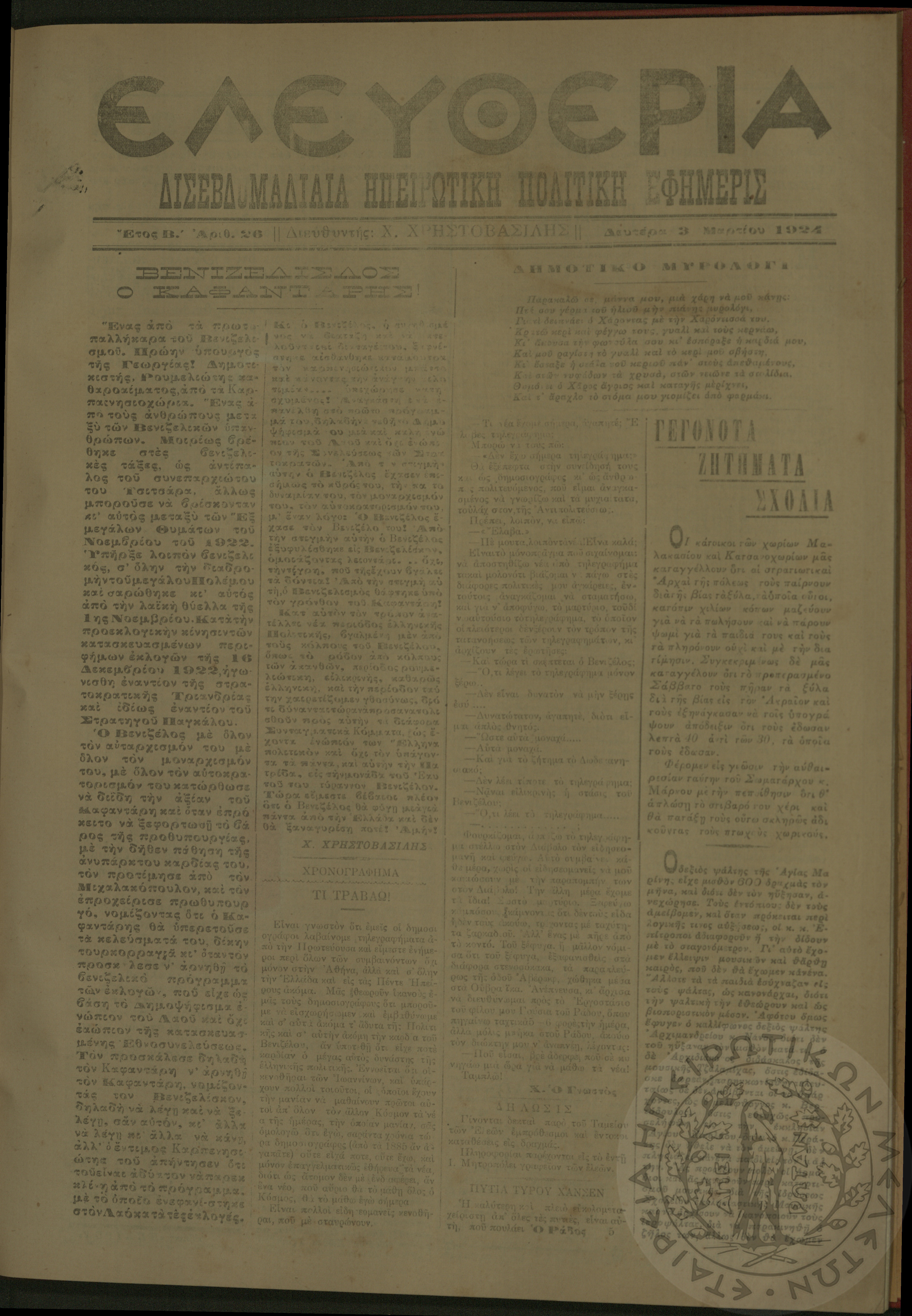 Ελευθερία: δισεβδομαδιαία Ηπειρωτική πολιτική εφημερίς, 1924, φ. 26