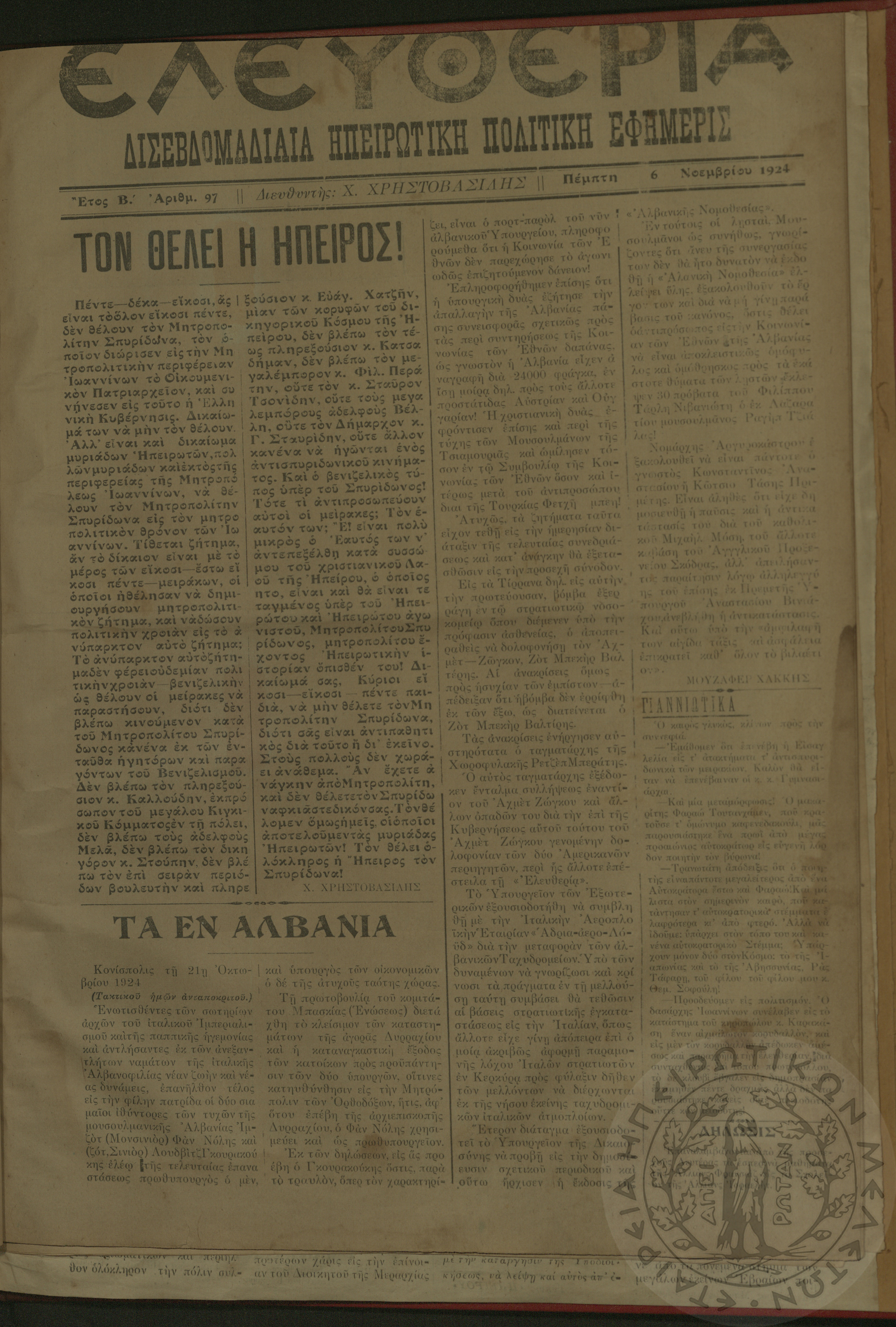 Ελευθερία: δισεβδομαδιαία Ηπειρωτική πολιτική εφημερίς, 1924, φ. 97
