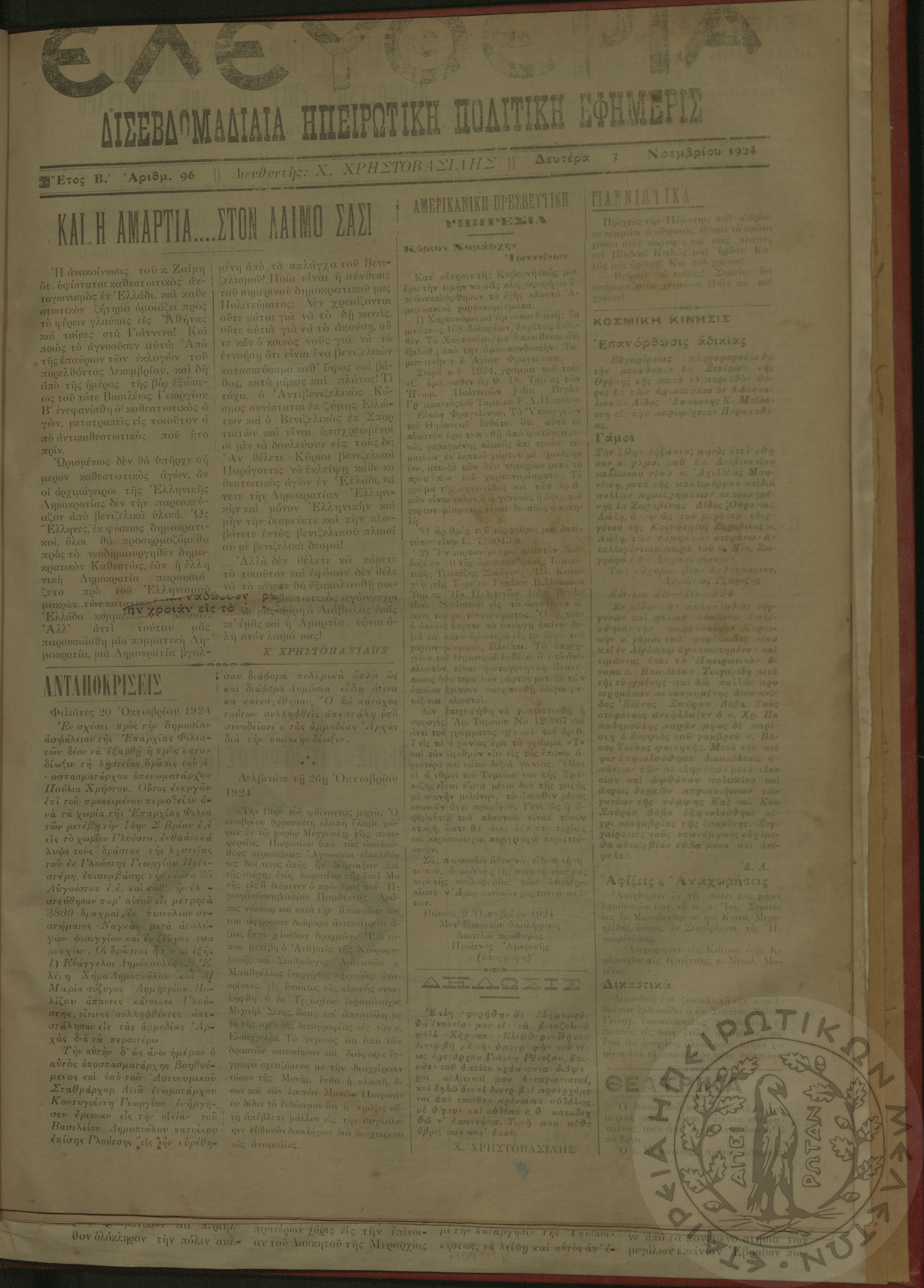 Ελευθερία: δισεβδομαδιαία Ηπειρωτική πολιτική εφημερίς, 1924, φ. 96