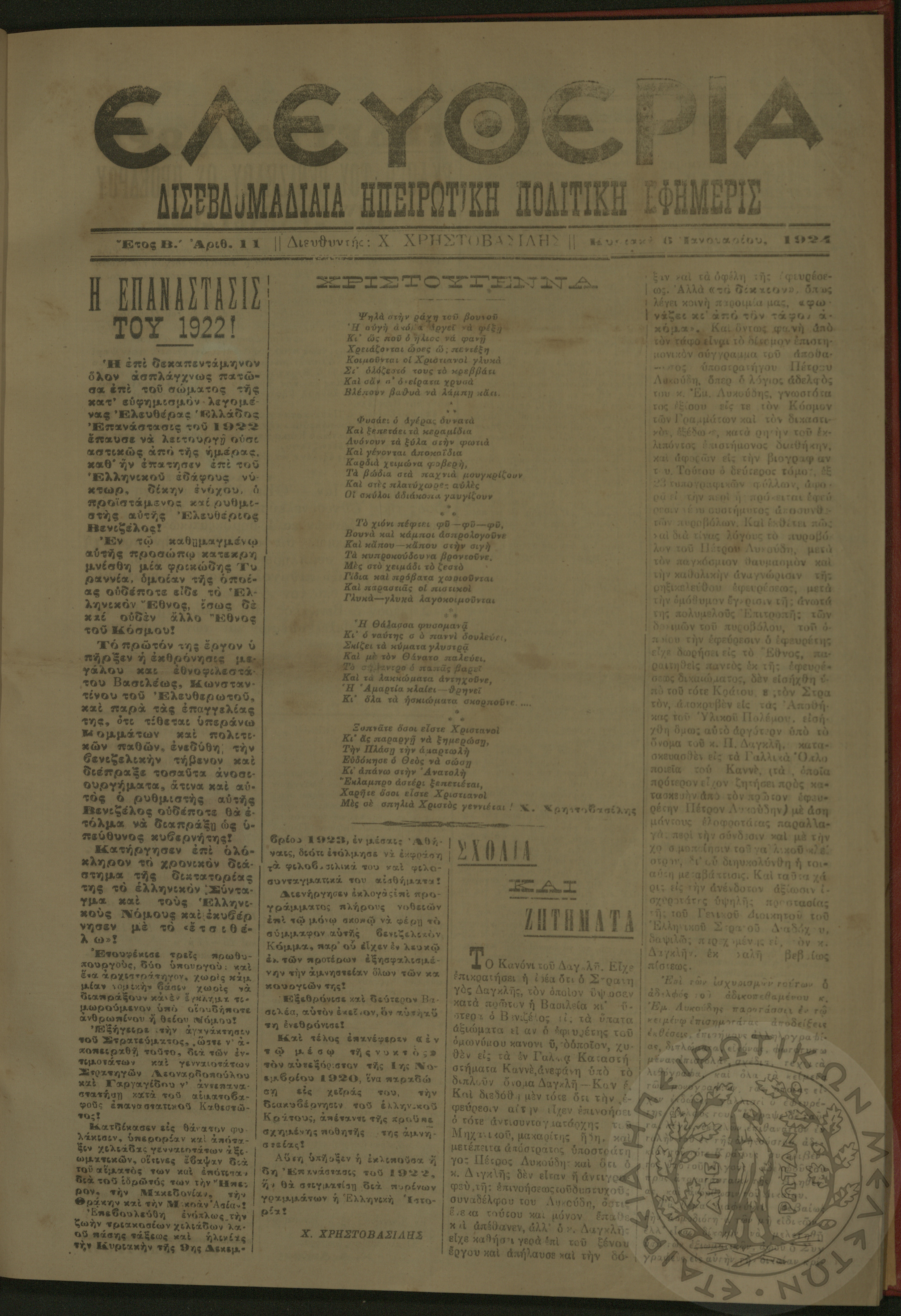 Ελευθερία: δισεβδομαδιαία Ηπειρωτική πολιτική εφημερίς, 1924, φ. 11