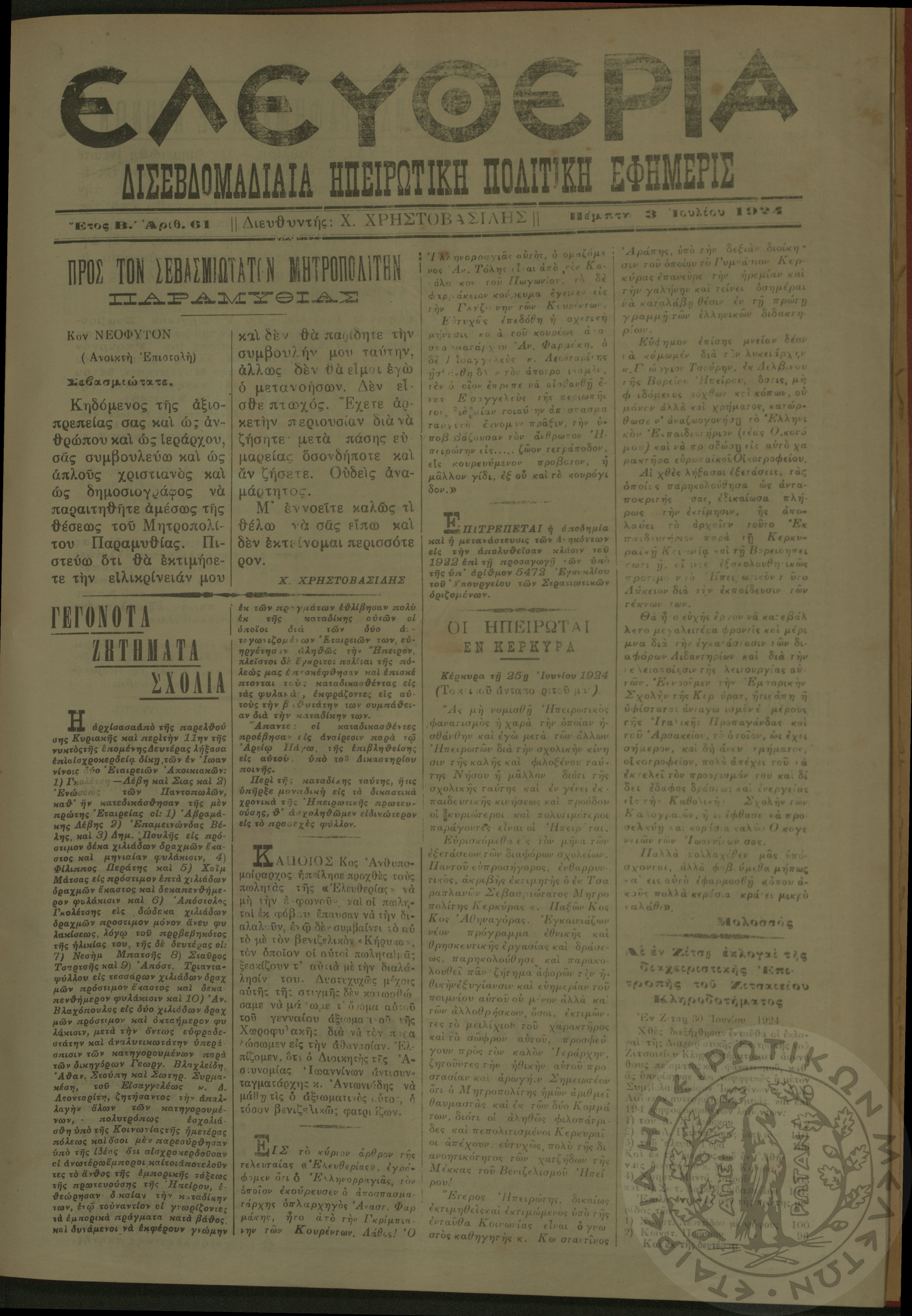 Ελευθερία: δισεβδομαδιαία Ηπειρωτική πολιτική εφημερίς, 1924, φ. 61