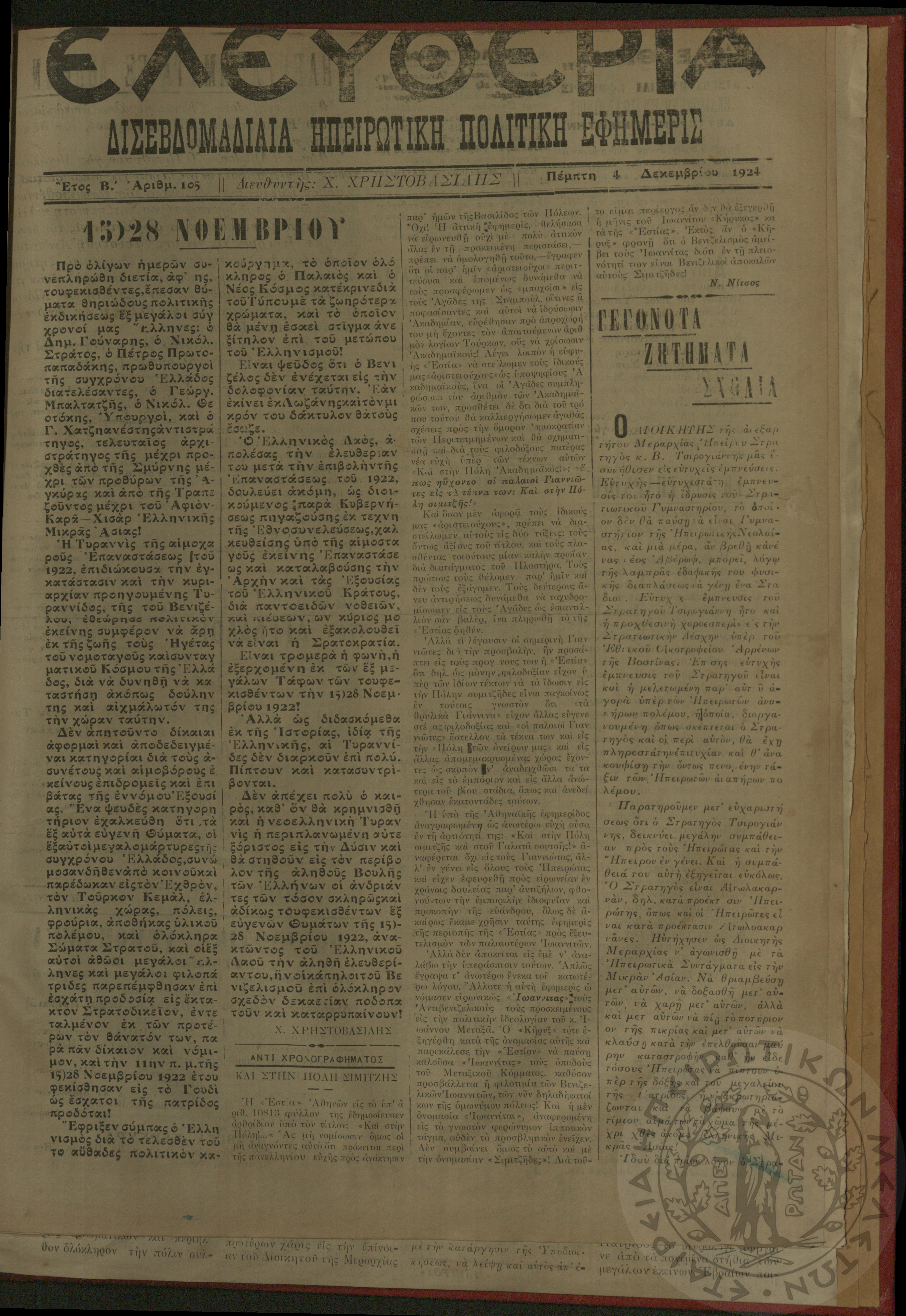 Ελευθερία: δισεβδομαδιαία Ηπειρωτική πολιτική εφημερίς, 1924, φ. 105