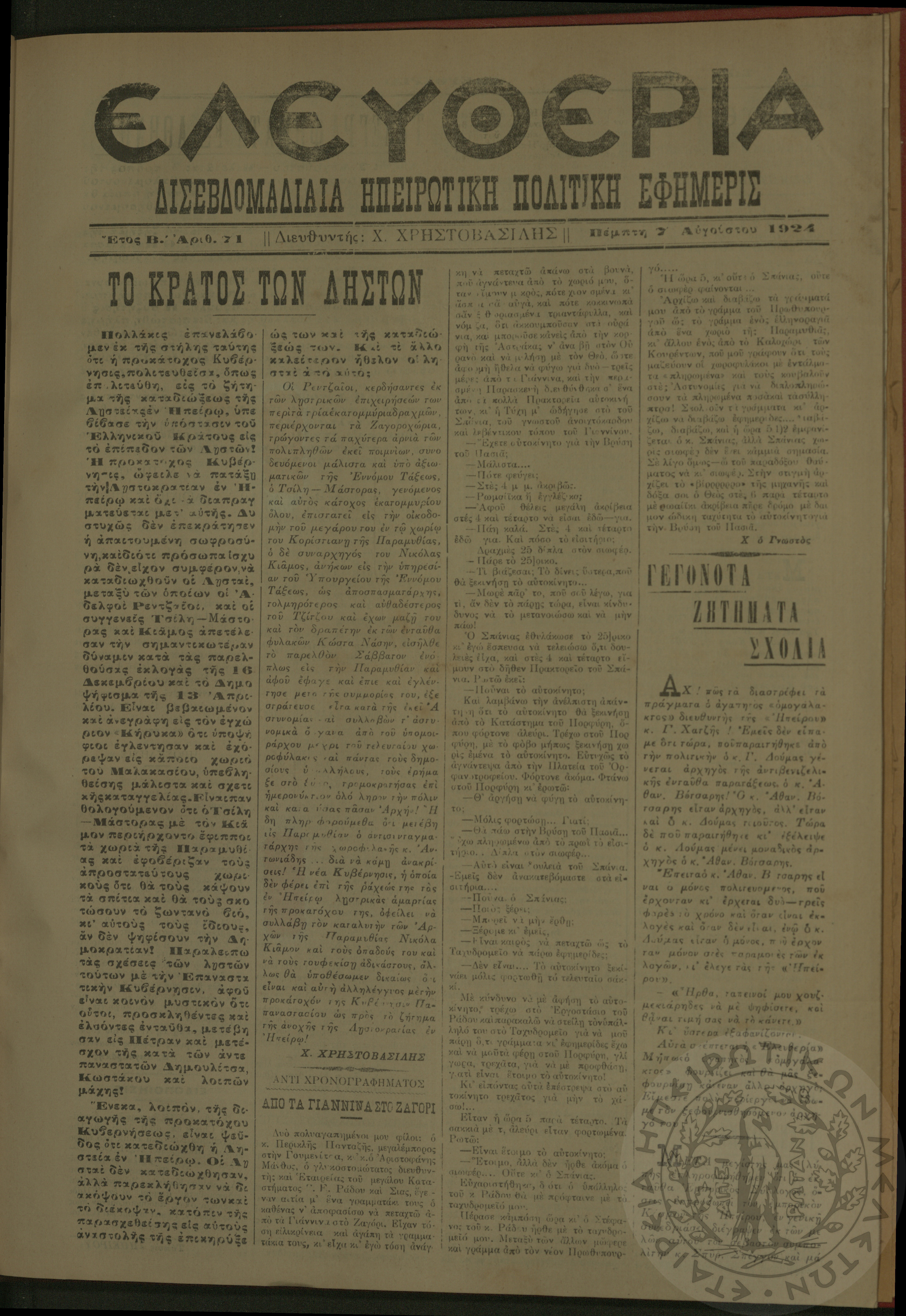 Ελευθερία: δισεβδομαδιαία Ηπειρωτική πολιτική εφημερίς, 1924, φ. 71