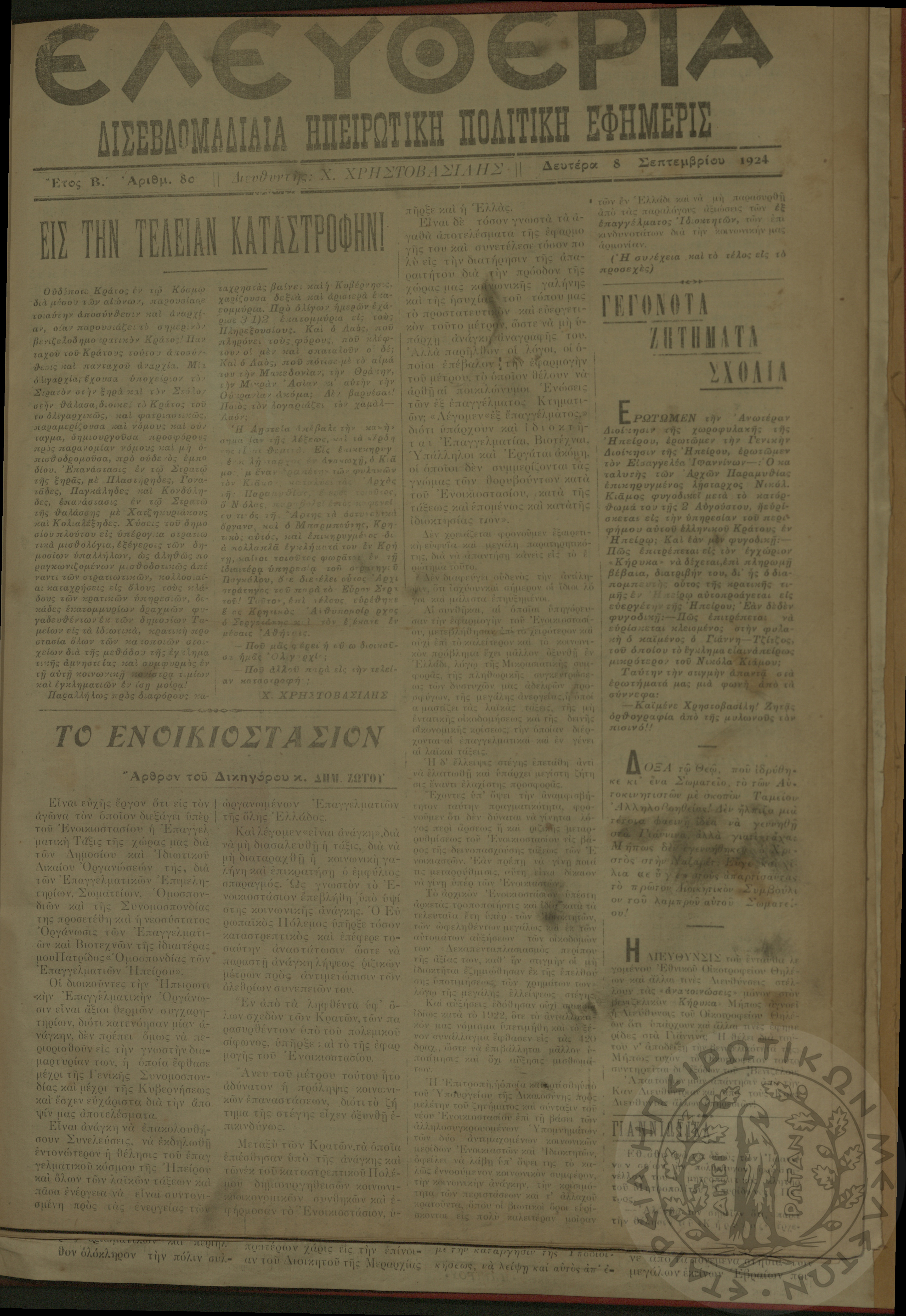 Ελευθερία: δισεβδομαδιαία Ηπειρωτική πολιτική εφημερίς, 1924, φ. 80