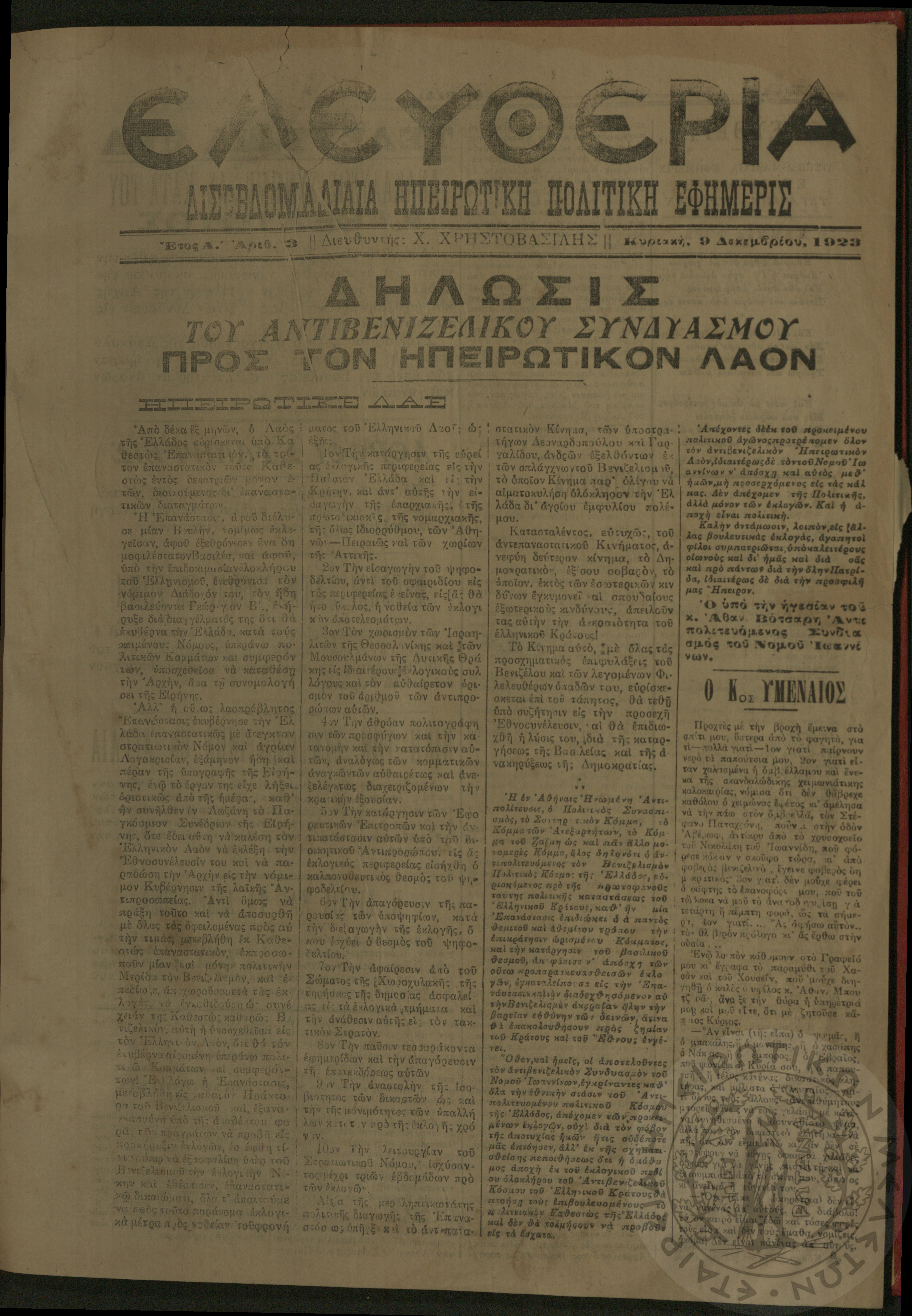 Ελευθερία: δισεβδομαδιαία Ηπειρωτική πολιτική εφημερίς, 1923, φ. 3