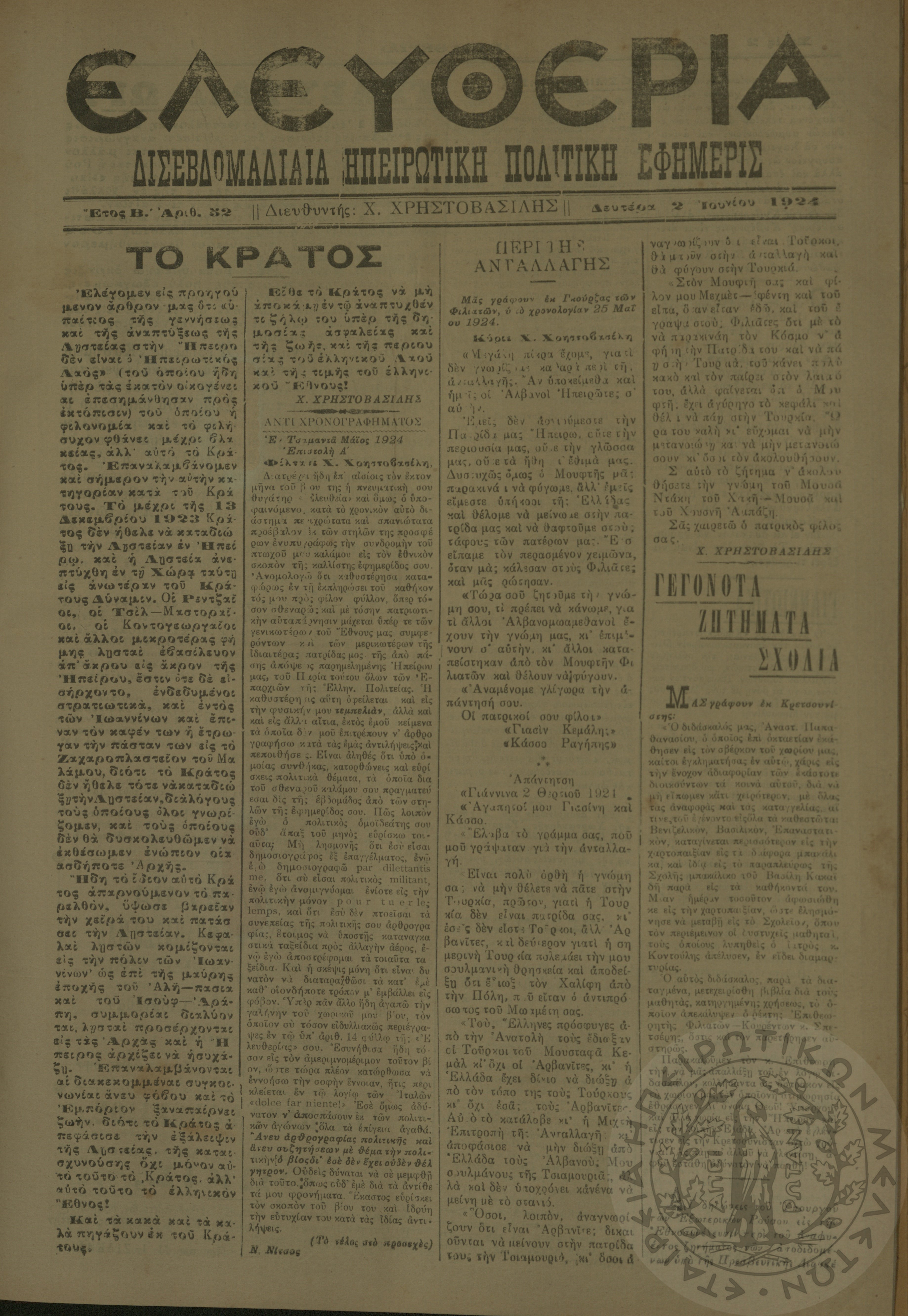Ελευθερία: δισεβδομαδιαία Ηπειρωτική πολιτική εφημερίς, 1924, φ. 32