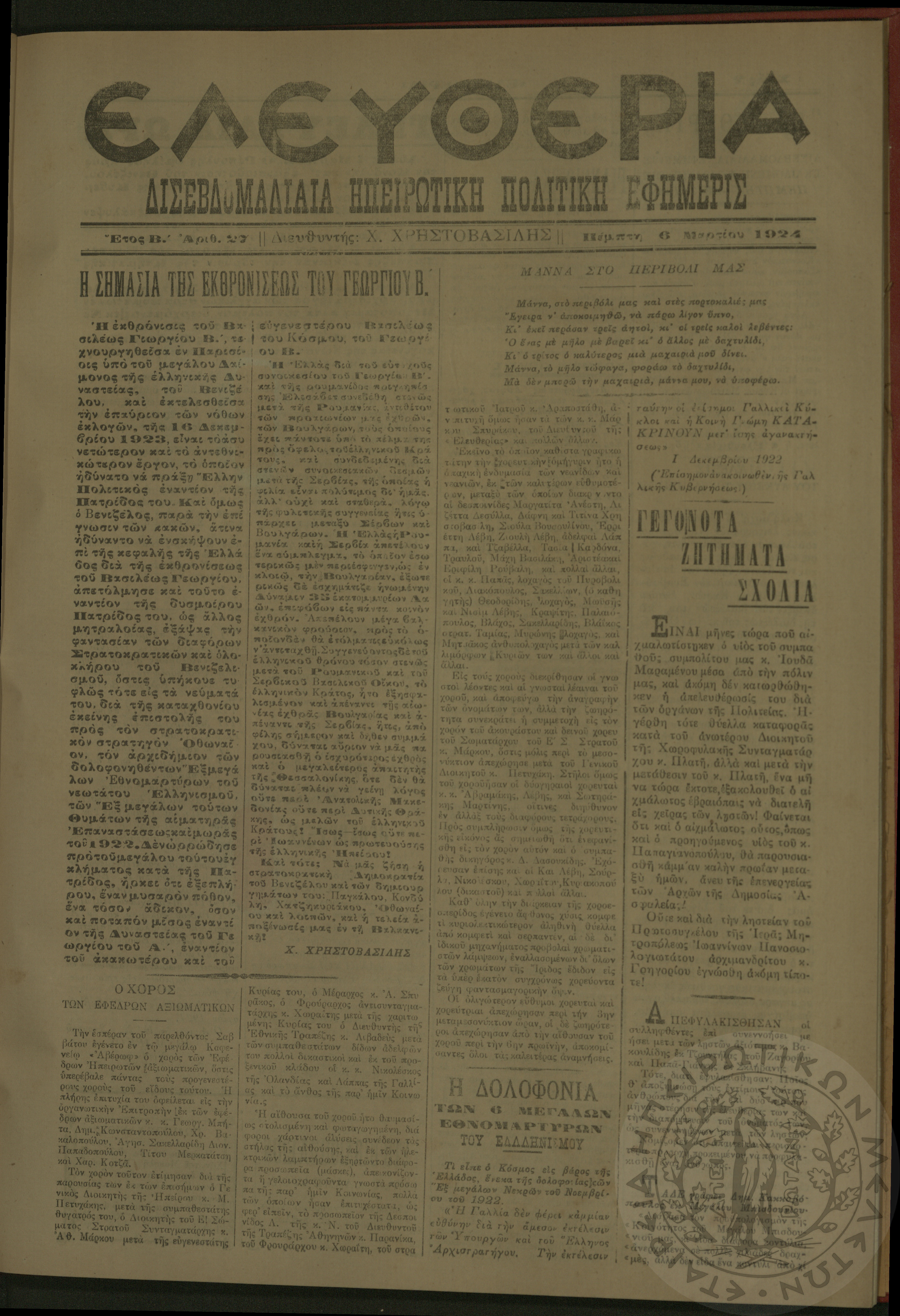 Ελευθερία: δισεβδομαδιαία Ηπειρωτική πολιτική εφημερίς, 1924, φ. 27