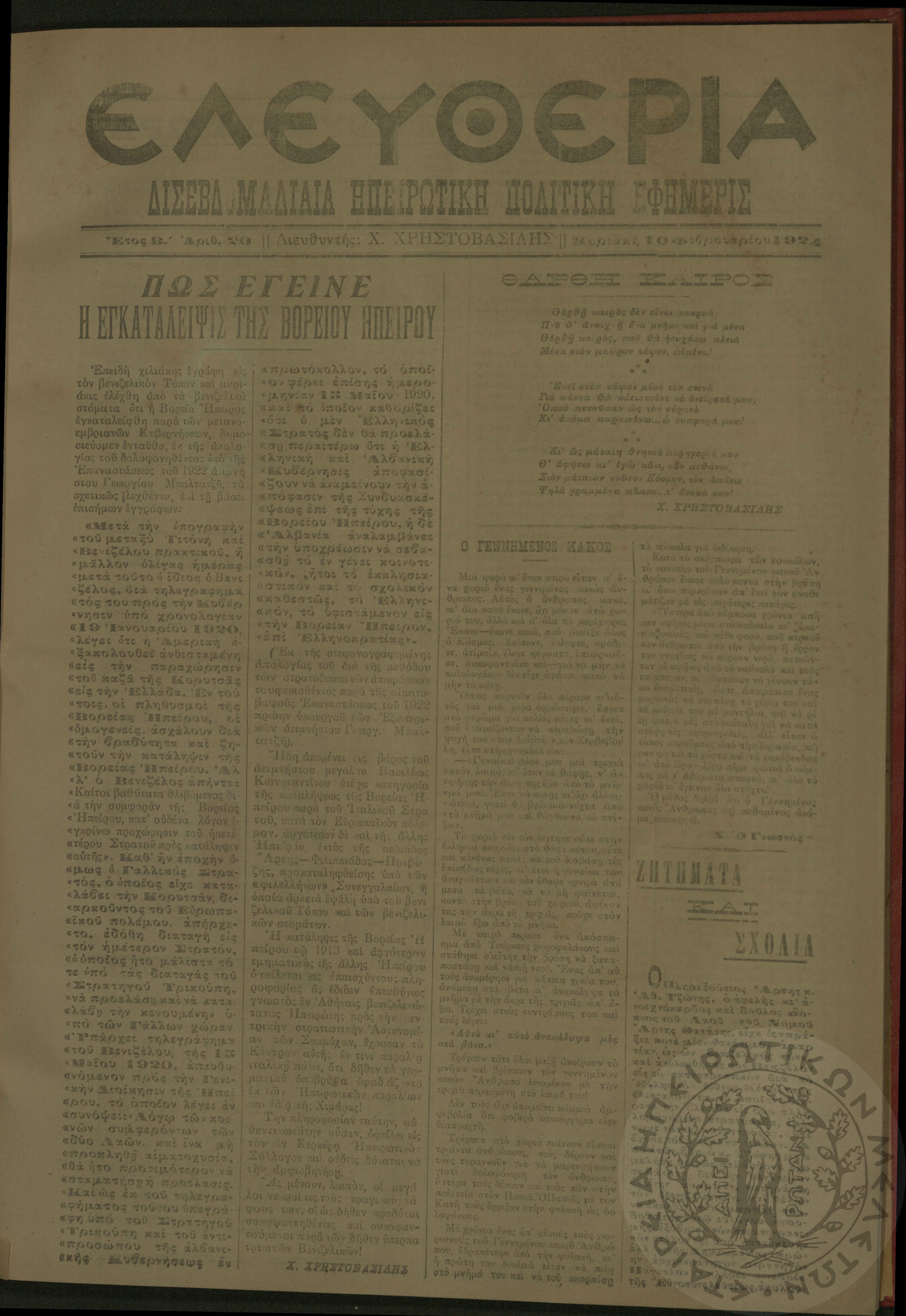 Ελευθερία: δισεβδομαδιαία Ηπειρωτική πολιτική εφημερίς, 1924, φ. 20