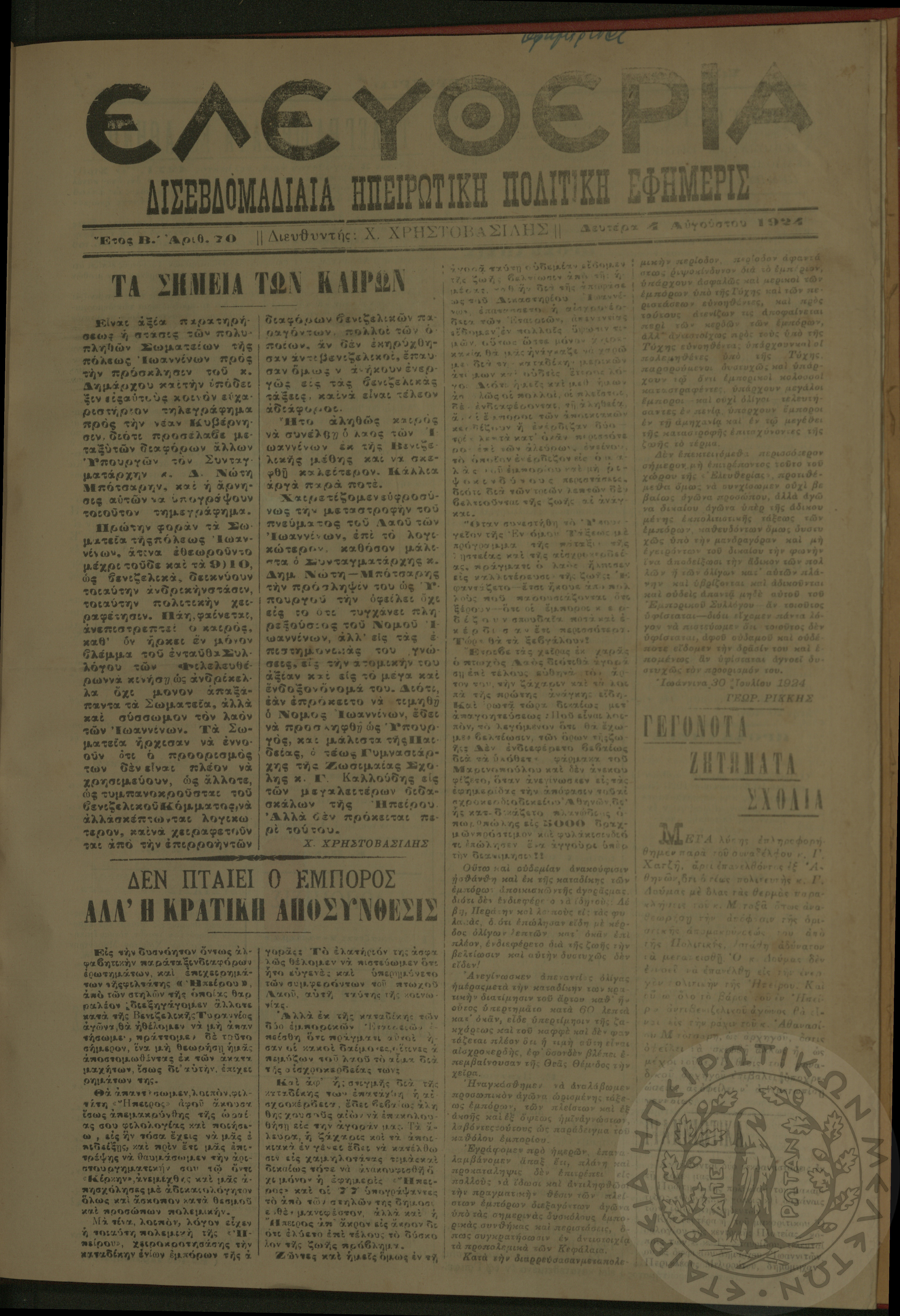 Ελευθερία: δισεβδομαδιαία Ηπειρωτική πολιτική εφημερίς, 1924, φ. 70