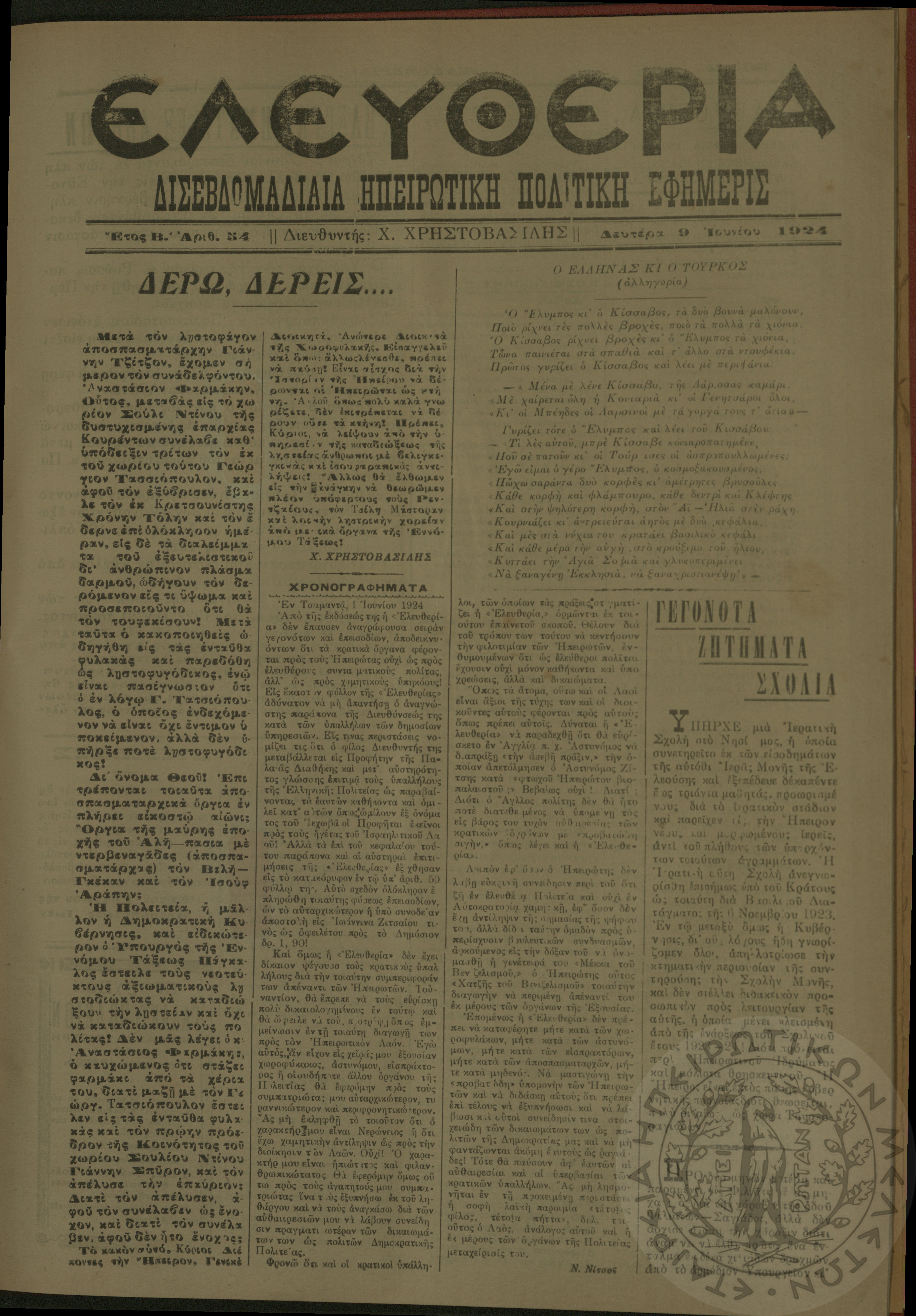 Ελευθερία: δισεβδομαδιαία Ηπειρωτική πολιτική εφημερίς, 1924, φ. 54