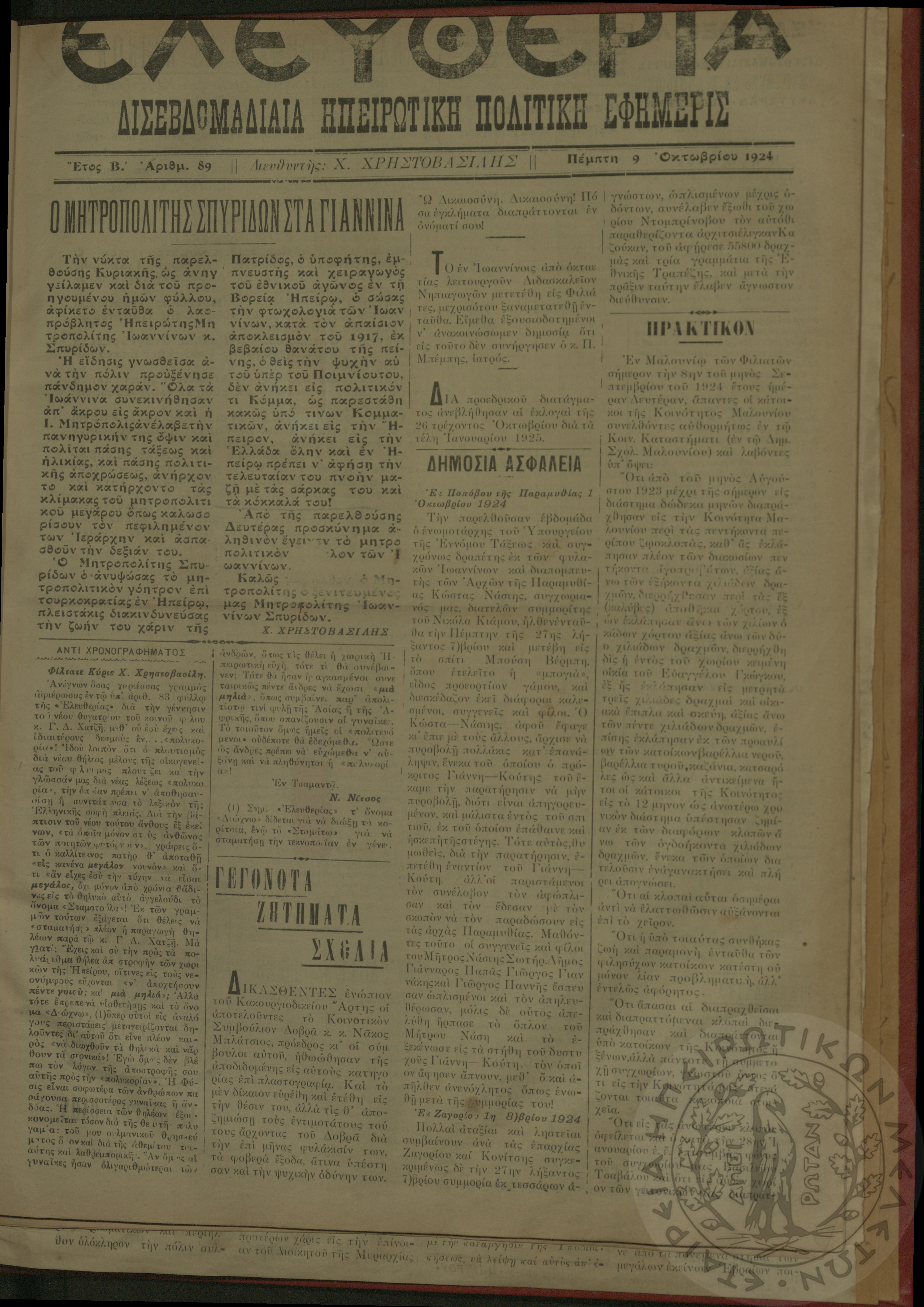 Ελευθερία: δισεβδομαδιαία Ηπειρωτική πολιτική εφημερίς, 1924, φ. 89