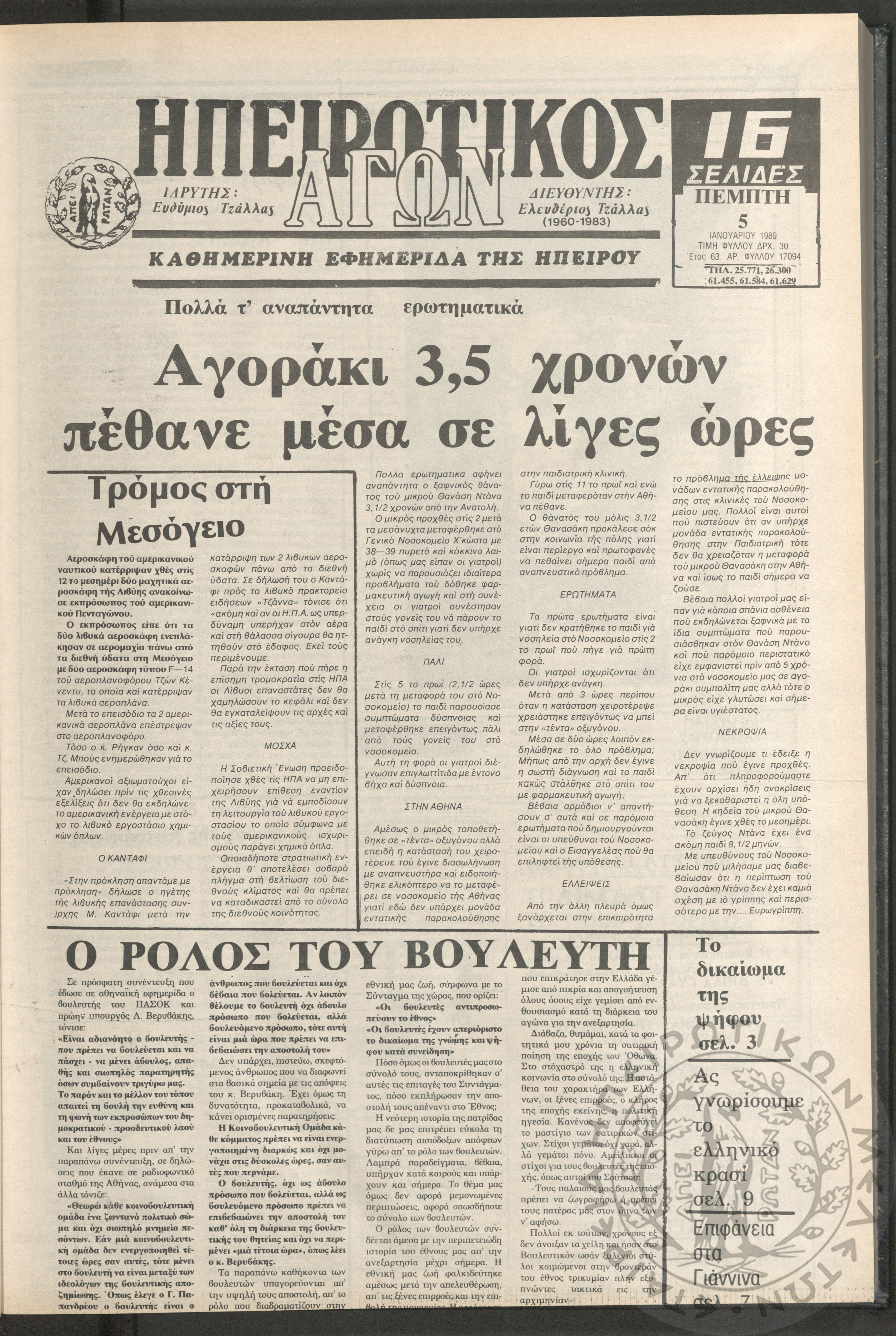 Ηπειρωτικός Αγών: καθημερινή εφημερίδα της Ηπείρου, 1989, φ. 17094