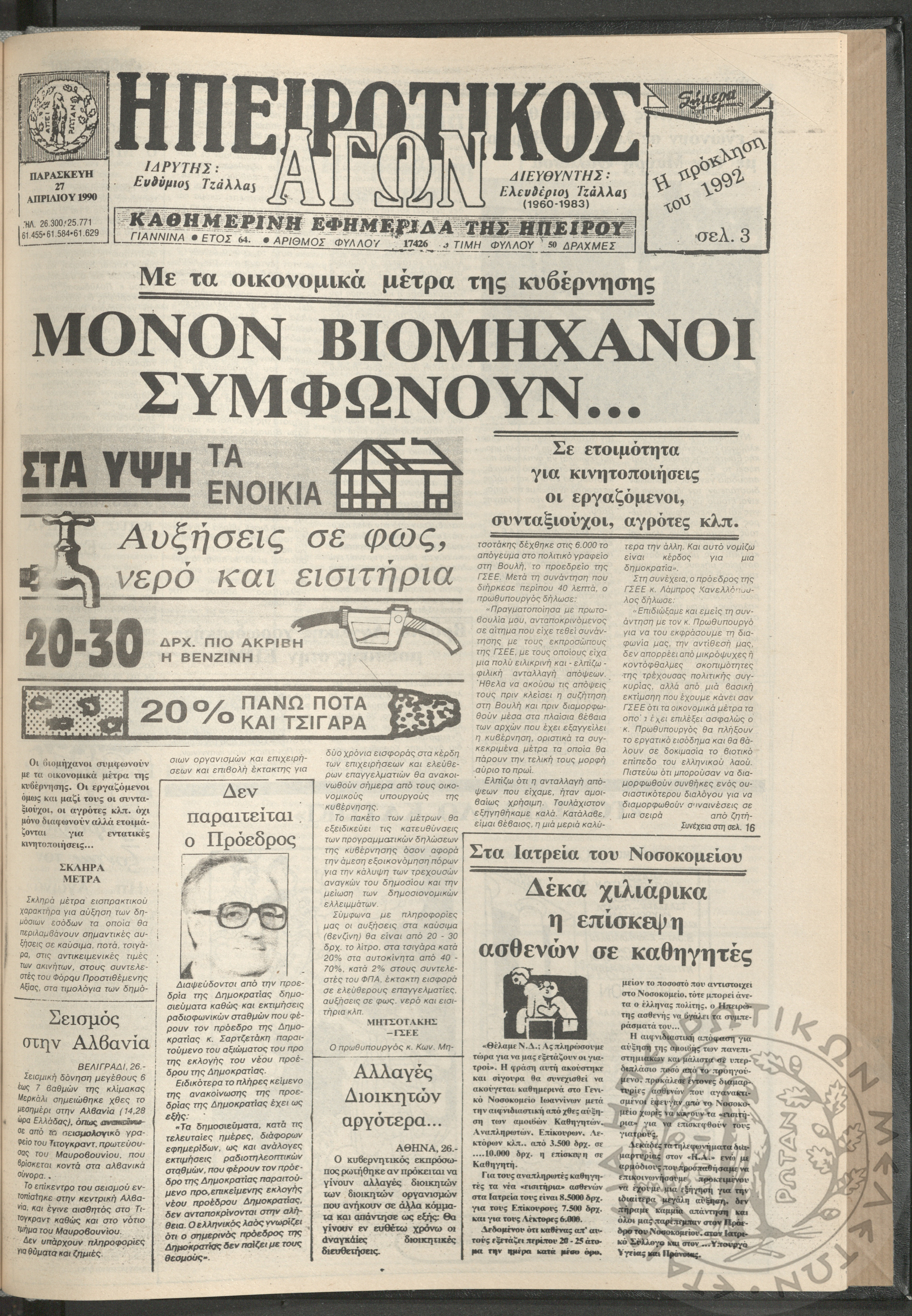 Ηπειρωτικός Αγών: καθημερινή εφημερίδα της Ηπείρου, 1990, φ. 17420