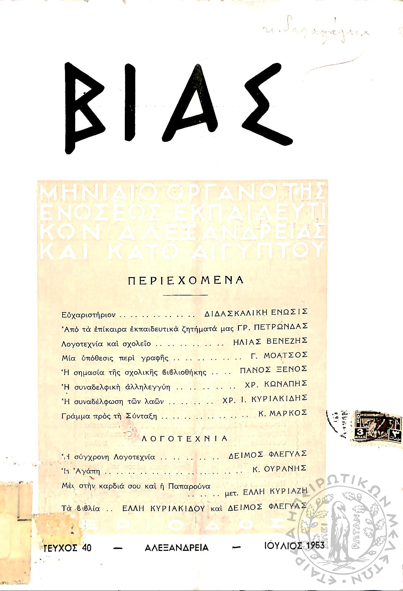 Βίας: επιθεώρηση επιστήμης, παιδείας και γραμμάτων - μηνιαίο όργανο της Ενώσεως Εκπαιδευτικών Αλεξανδρείας και Κάτω Αιγύπτου (τεύχ. 40)...