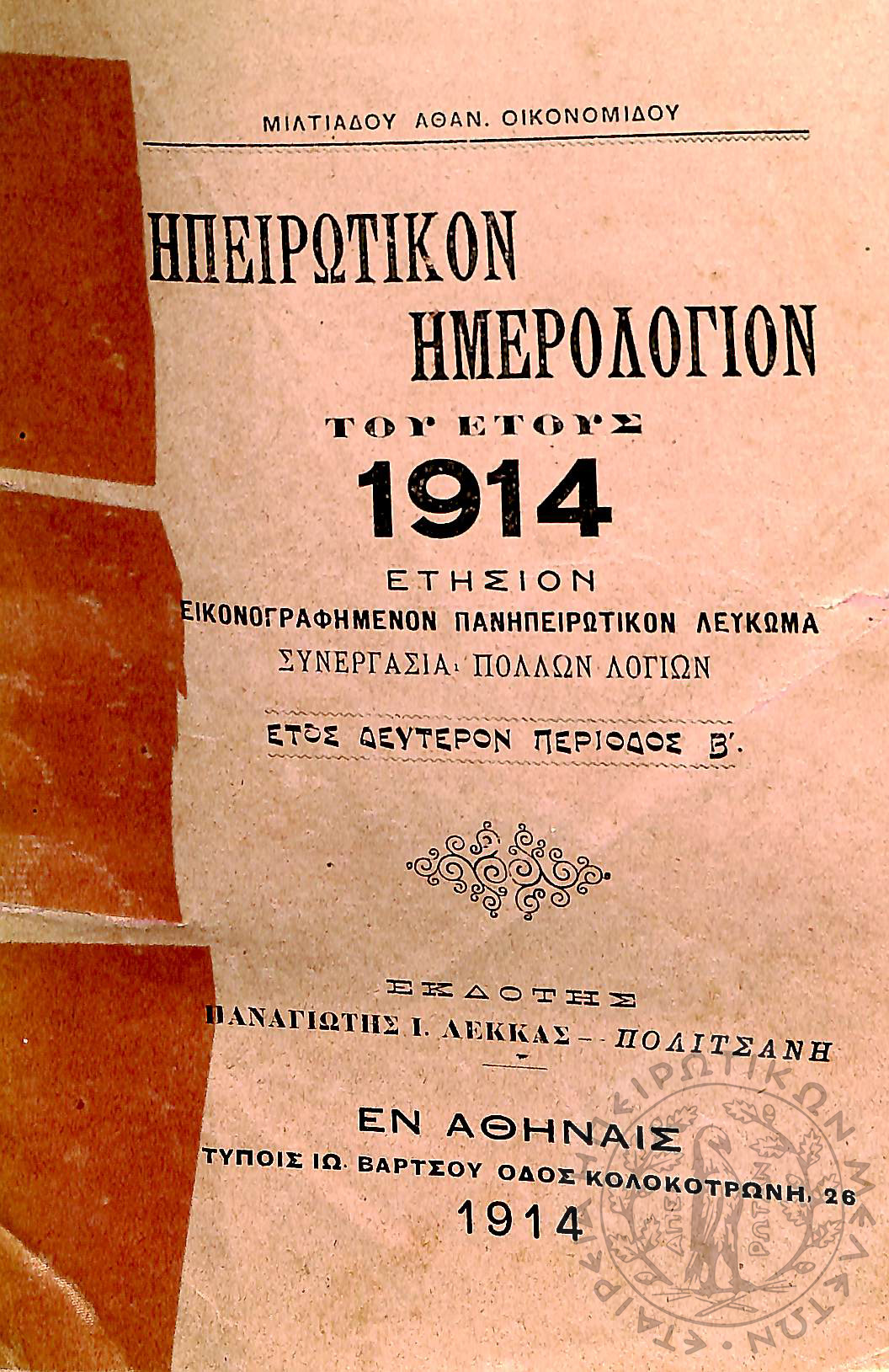 Ηπειρωτικόν ημερολόγιον του έτους 1914: ετήσιον εικονογραφημένον Πανηπειρωτικόν λεύκωμαΈτος Β΄, περίοδος Β΄...