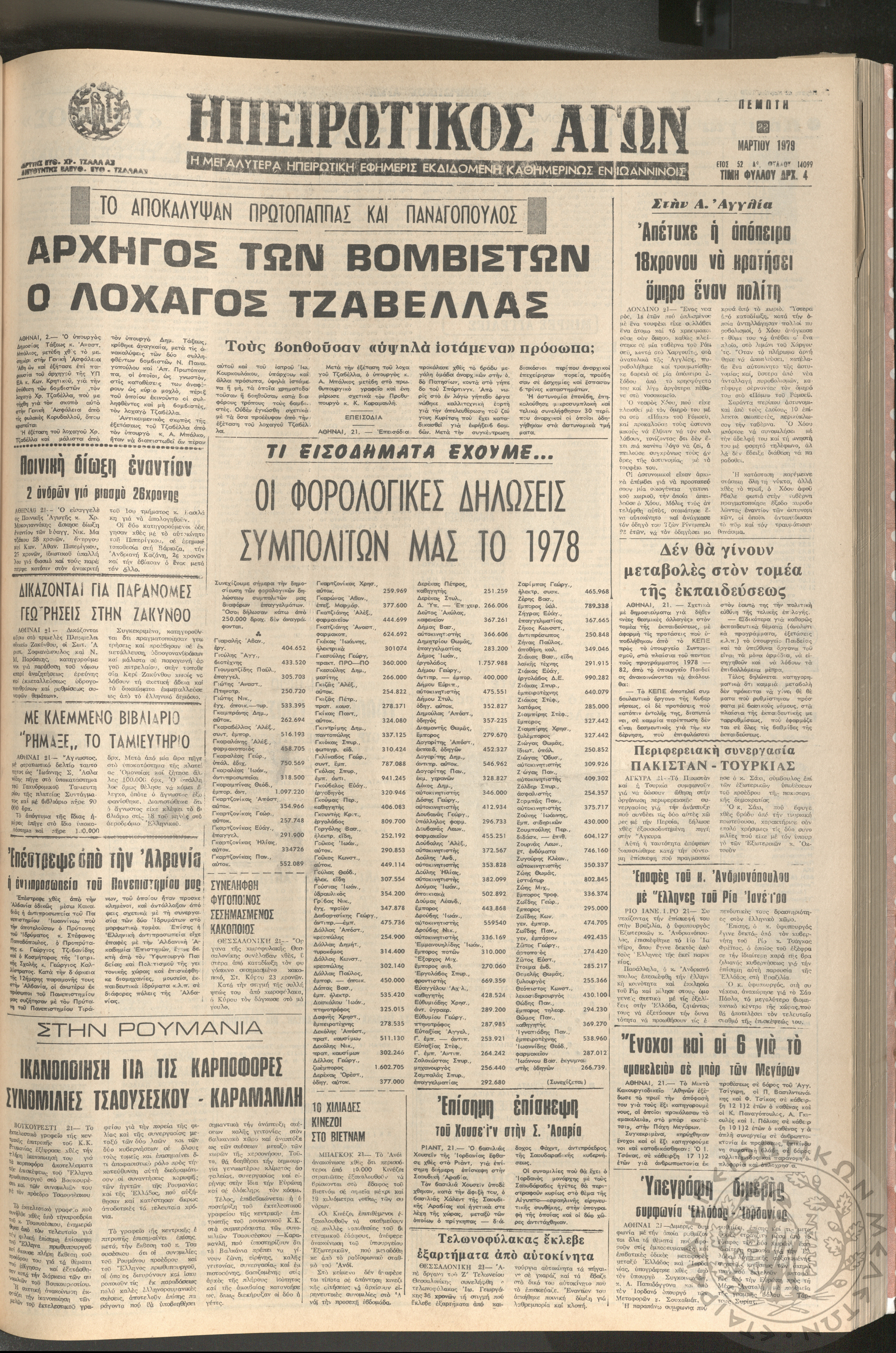Ηπειρωτικός Αγών: η μεγαλυτέρα Ηπειρωτική εφημερίς εκδιδομένη καθημερινώς εν Ιωαννίνοις, 1979, φ. 14099Έτος 52, φ. 14099...