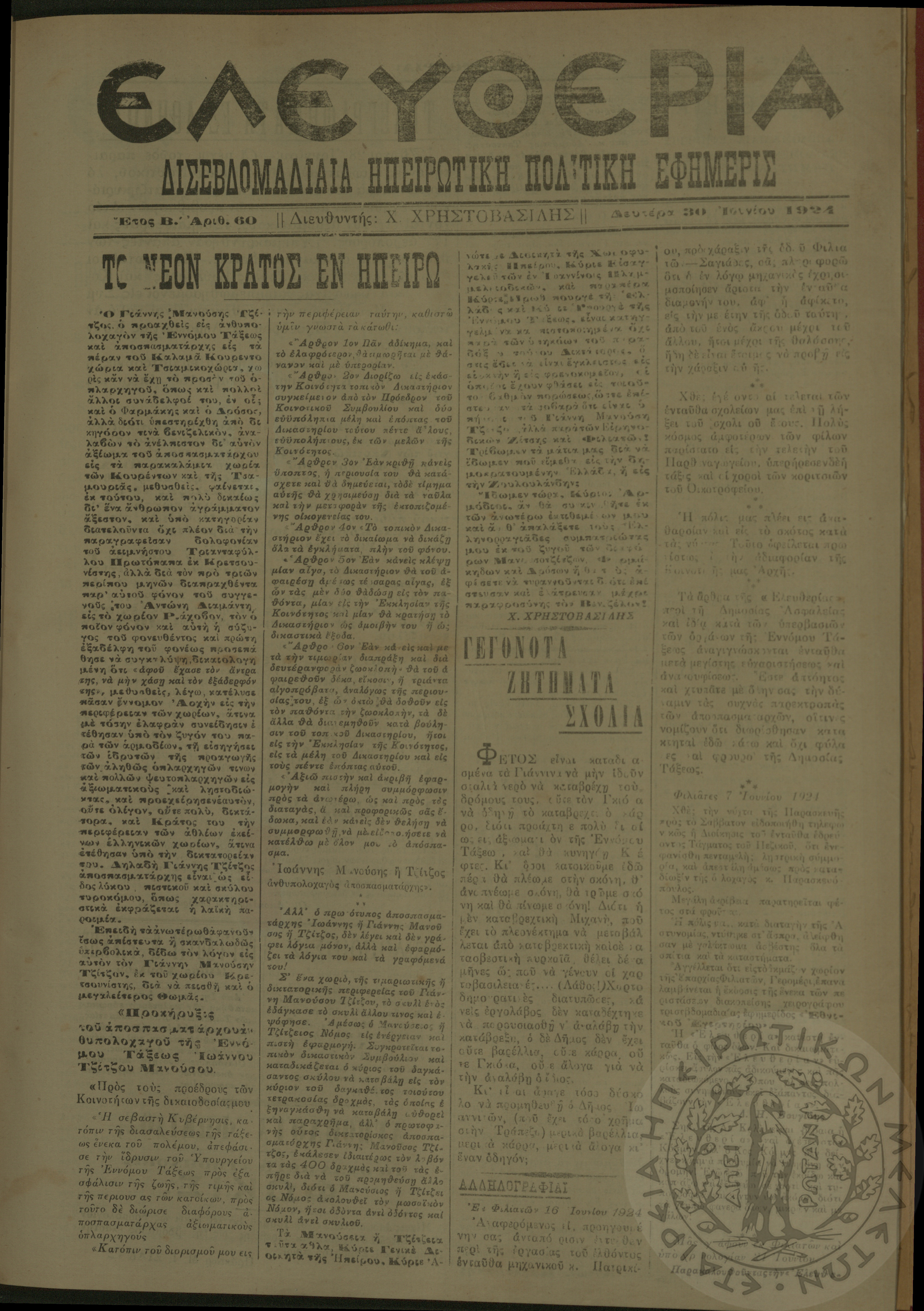 Ελευθερία: δισεβδομαδιαία Ηπειρωτική πολιτική εφημερίς, 1924, φ. 60