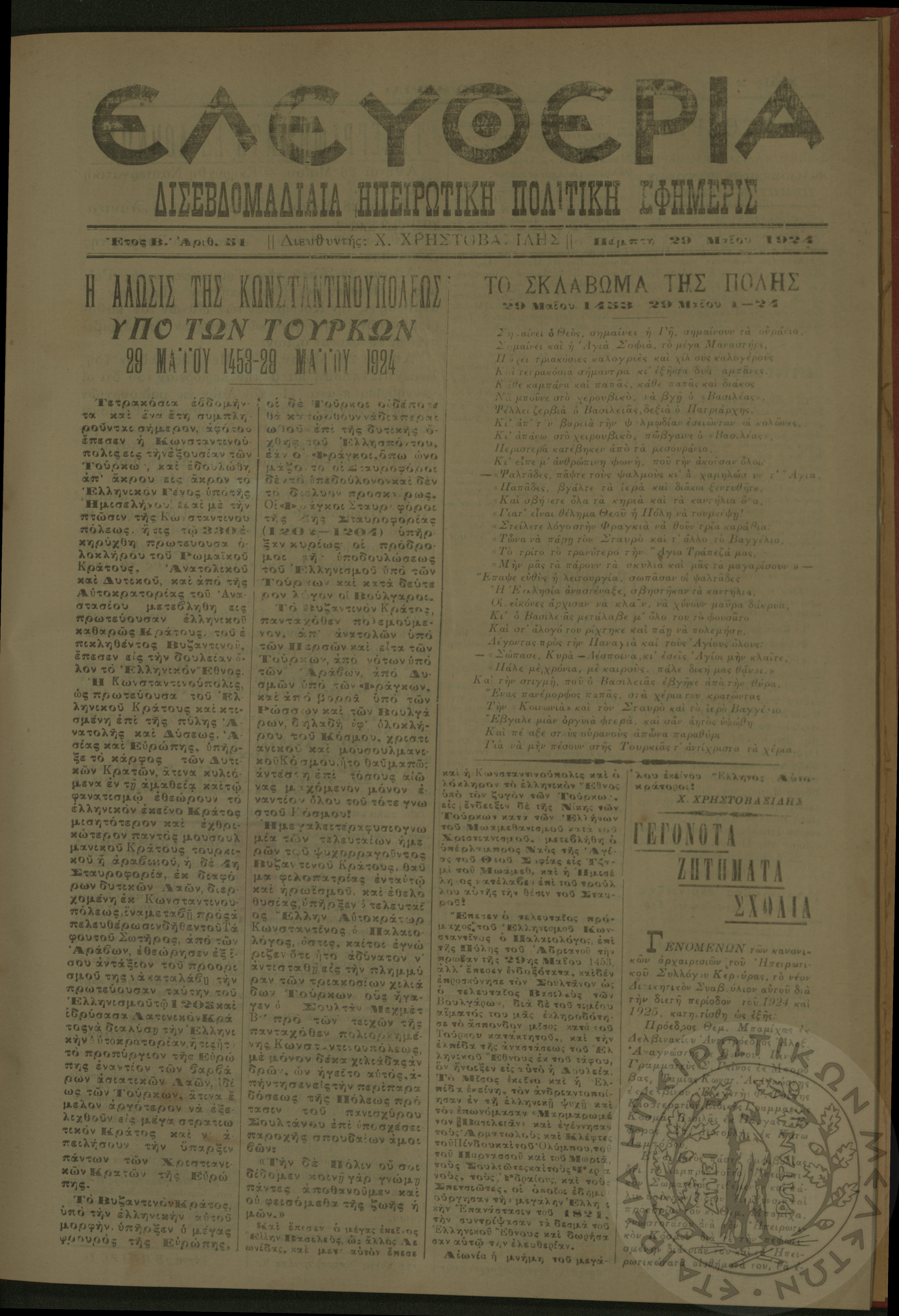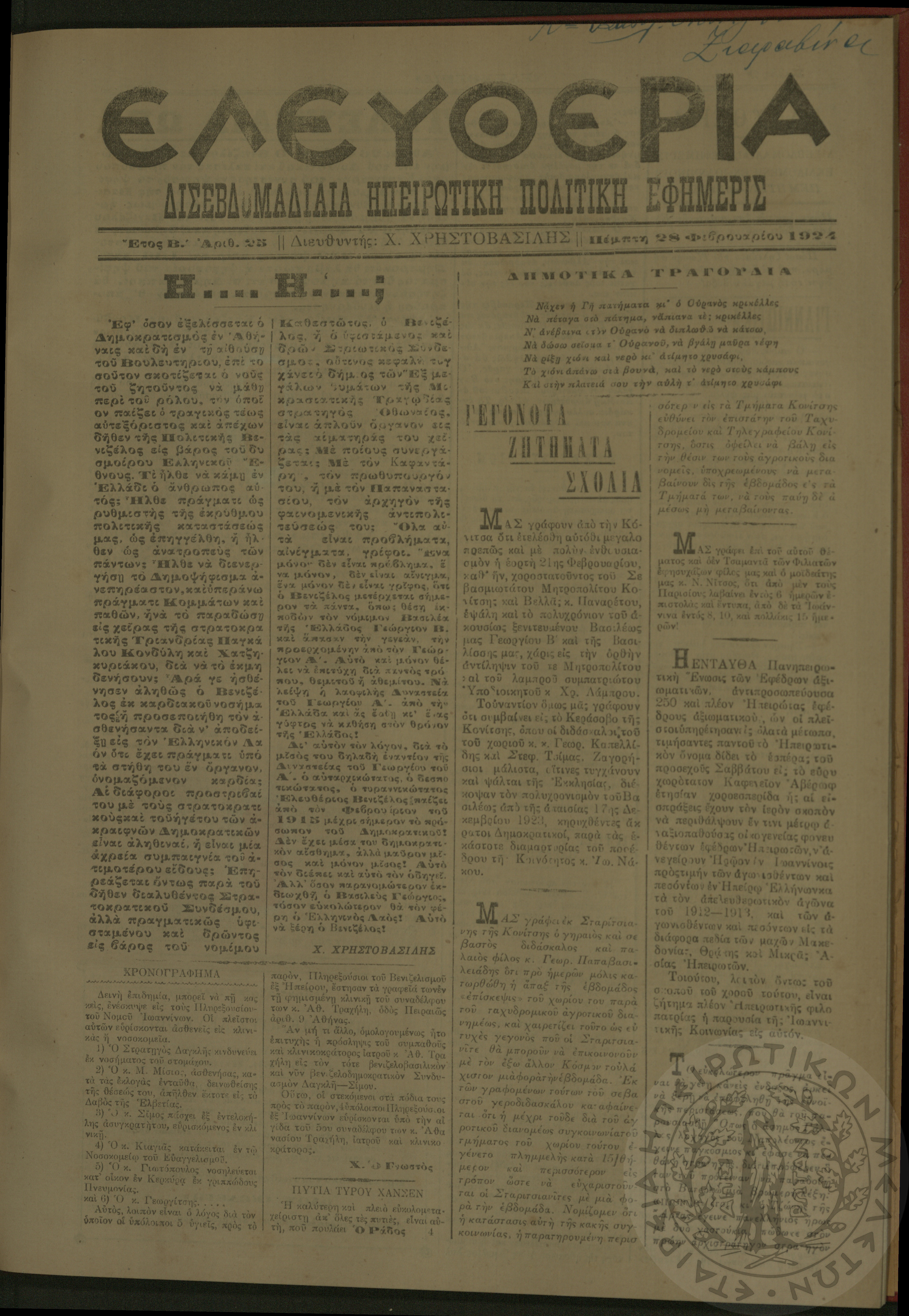 Ελευθερία: δισεβδομαδιαία Ηπειρωτική πολιτική εφημερίς, 1924, φ. 25