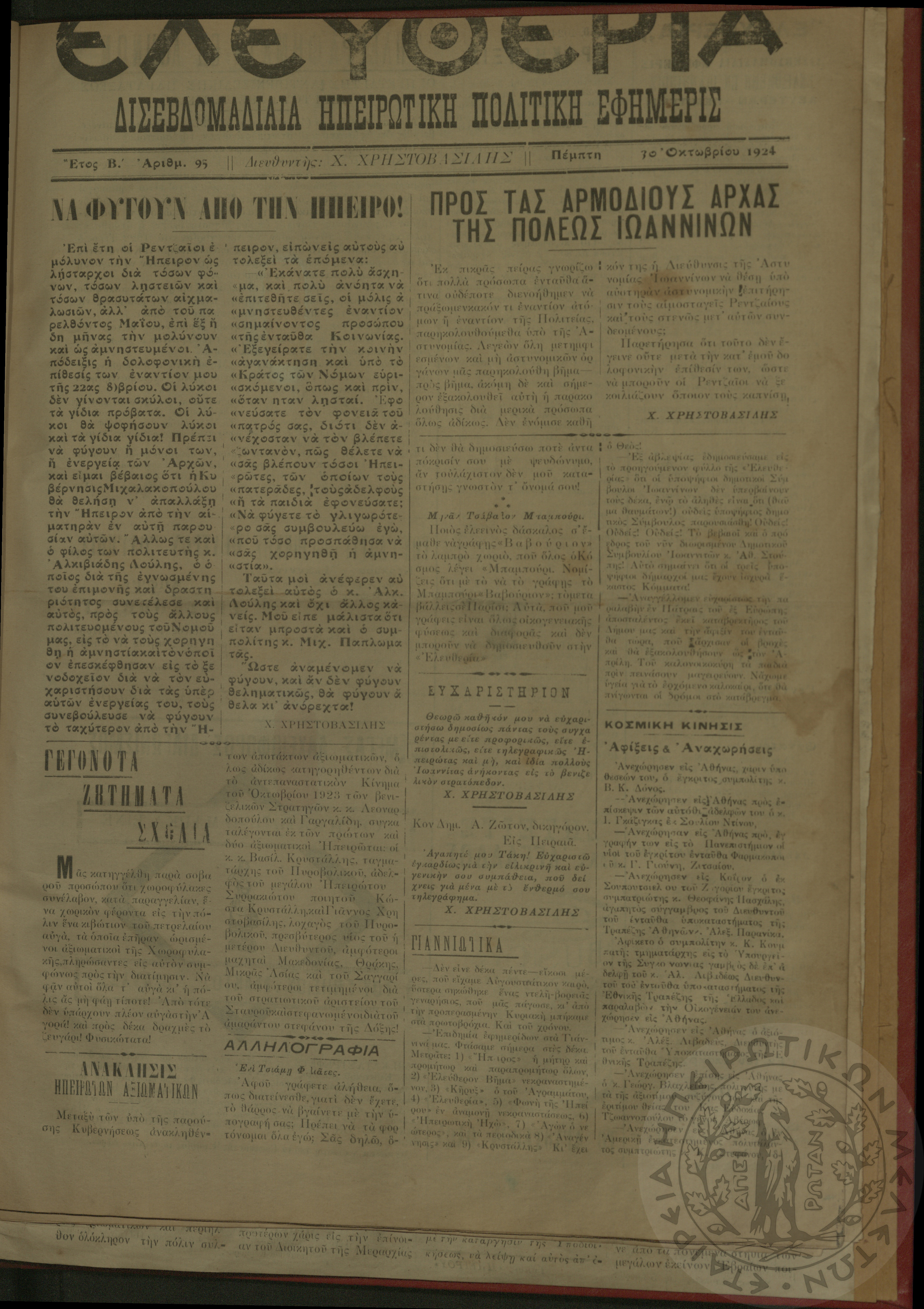 Ελευθερία: δισεβδομαδιαία Ηπειρωτική πολιτική εφημερίς, 1924, φ. 95