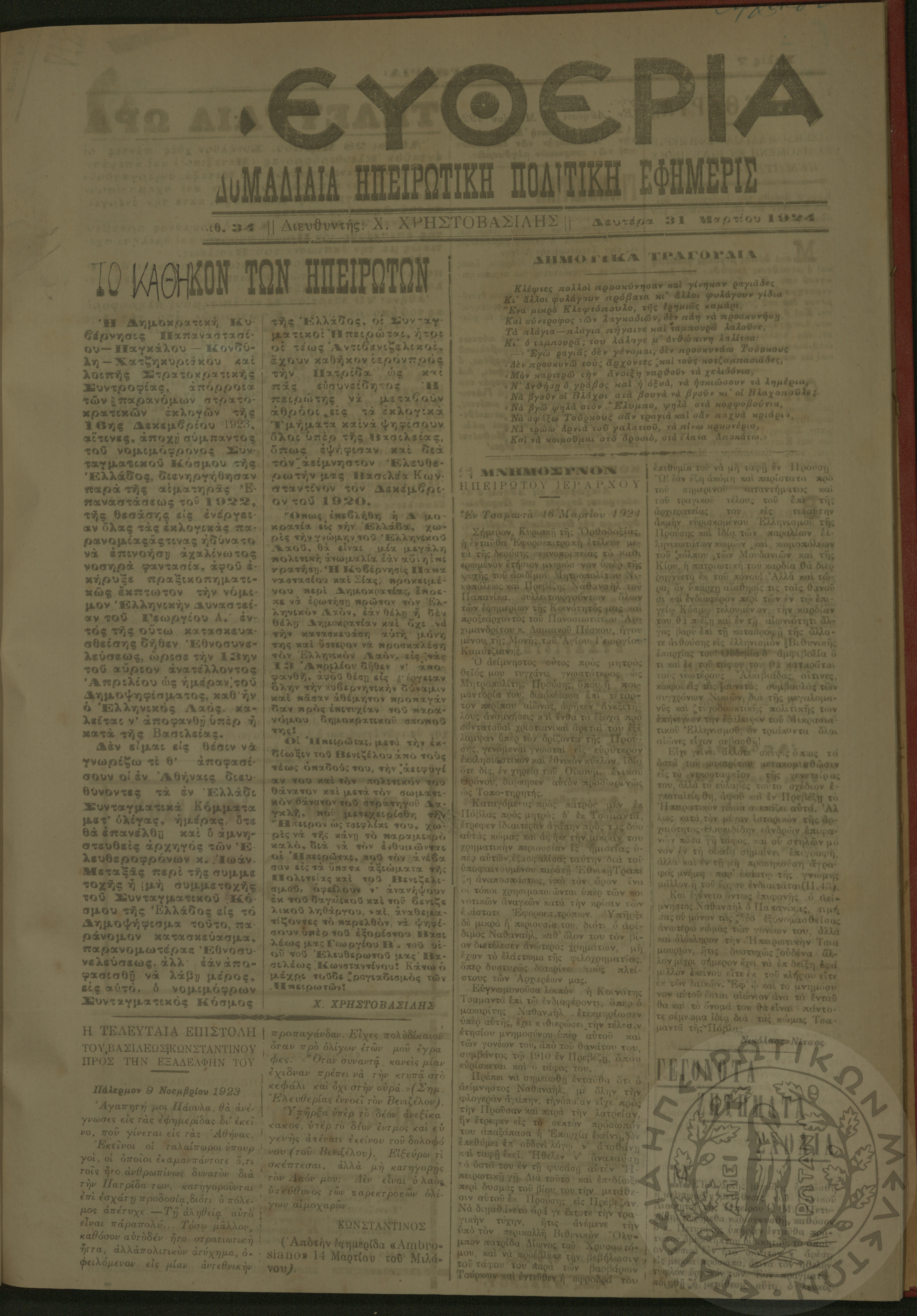 Ελευθερία: δισεβδομαδιαία Ηπειρωτική πολιτική εφημερίς, 1924, φ. 34