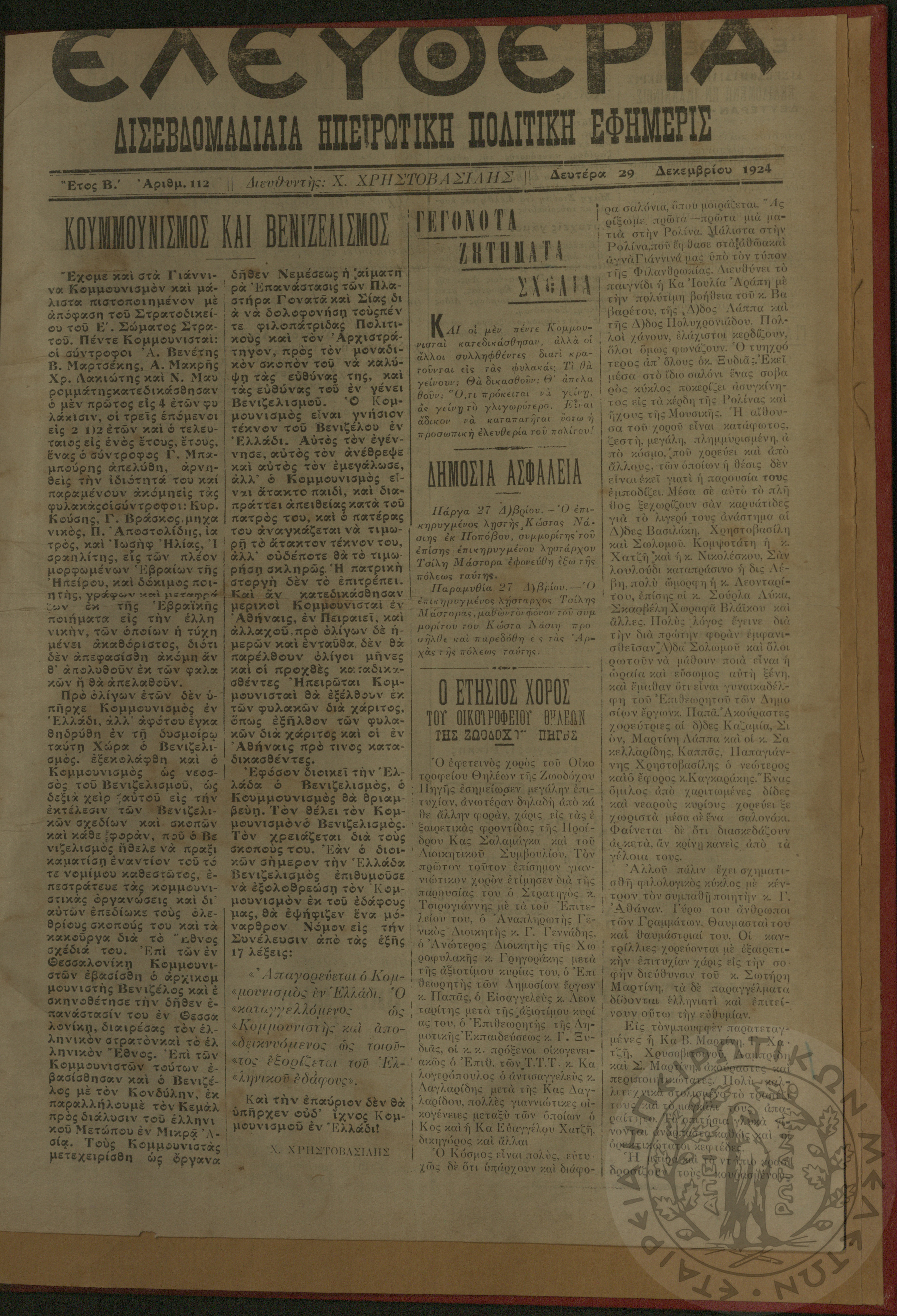 Ελευθερία: δισεβδομαδιαία Ηπειρωτική πολιτική εφημερίς, 1924, φ. 112