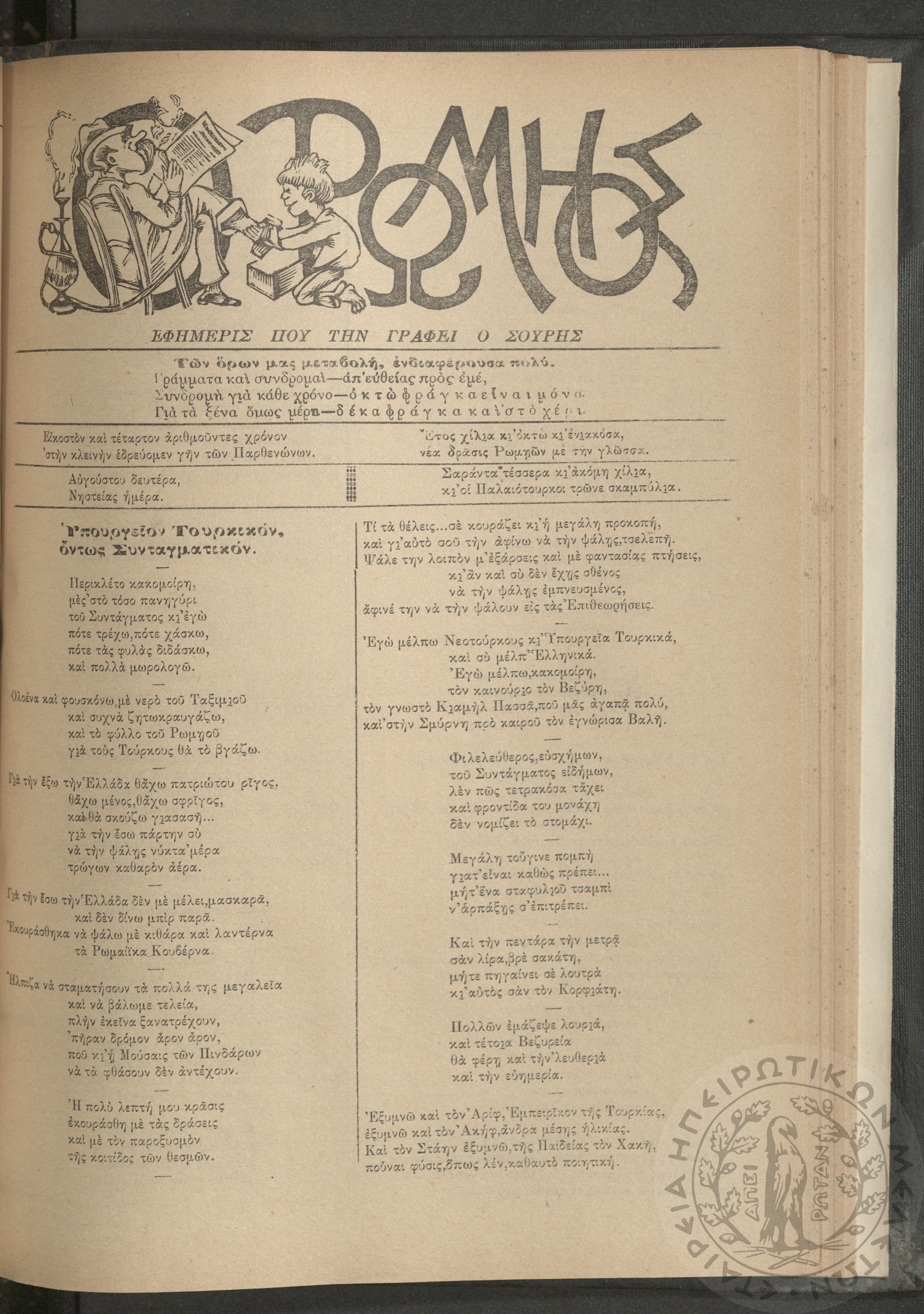 Ο Ρωμηός: Εφημερίς που την γράφει ο Σουρής, 1908, φ. 1052