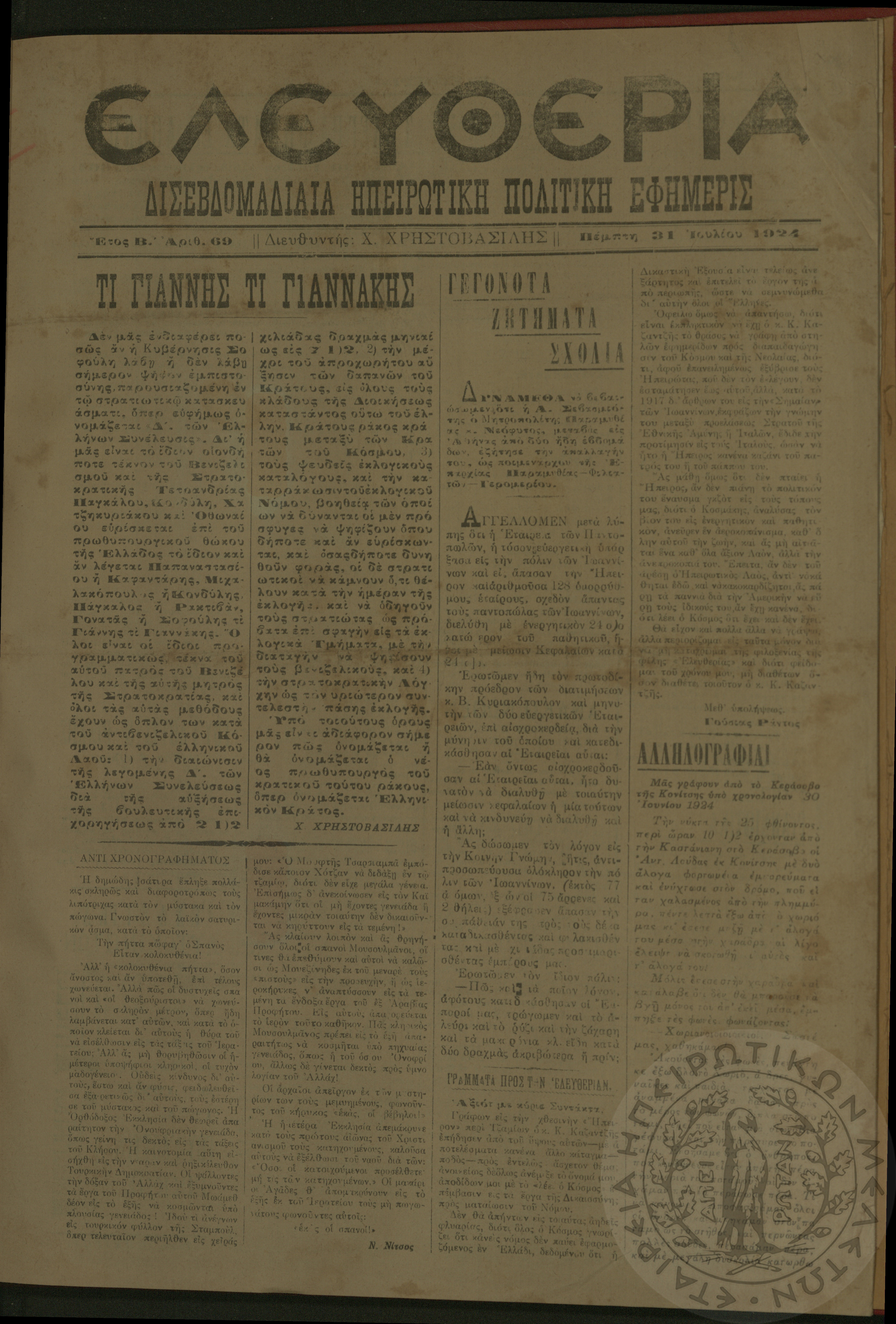 Ελευθερία: δισεβδομαδιαία Ηπειρωτική πολιτική εφημερίς, 1924, φ. 69