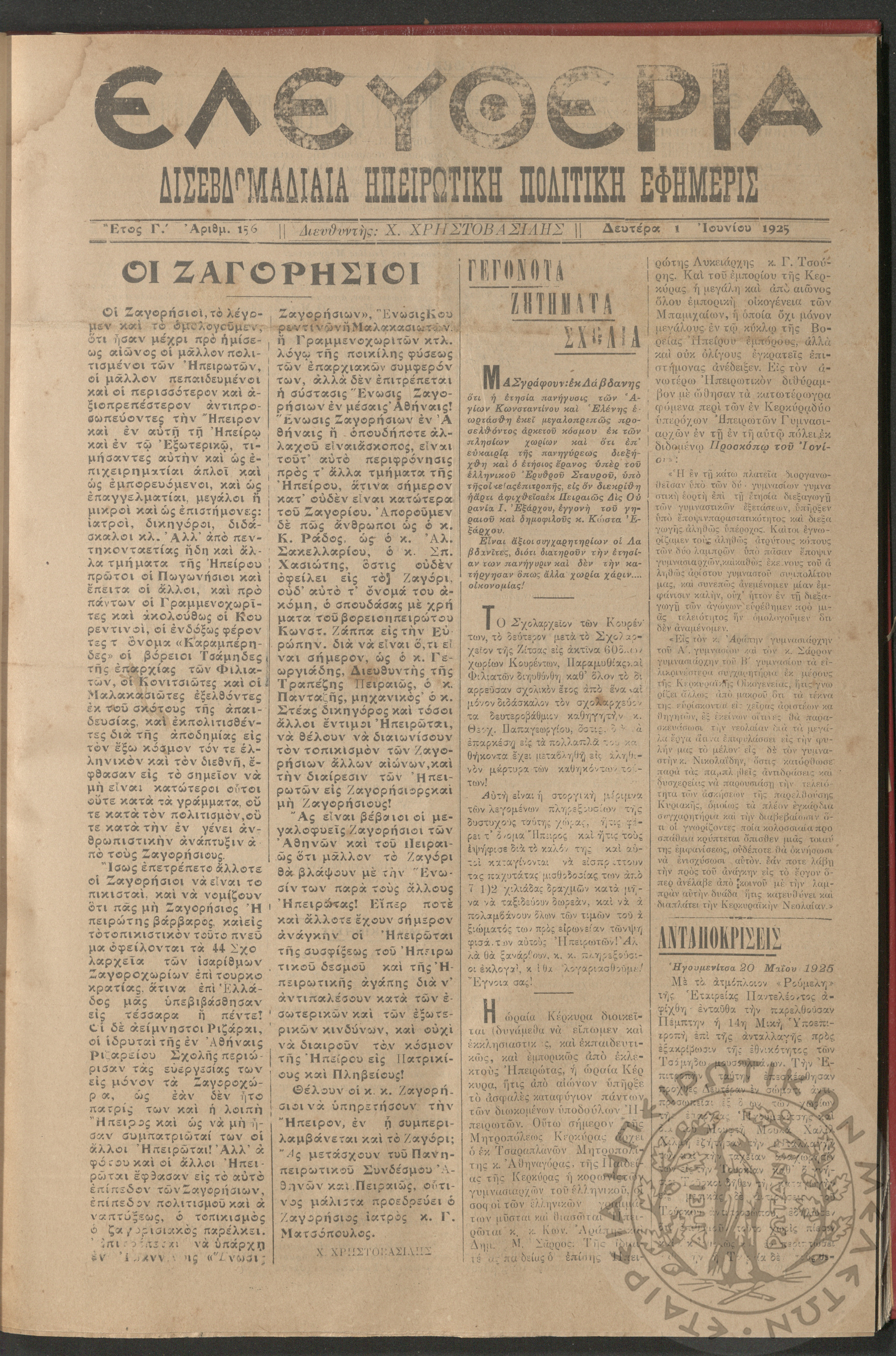 Ελευθερία: δισεβδομαδιαία Ηπειρωτική πολιτική εφημερίς, 1925, φ. 156
