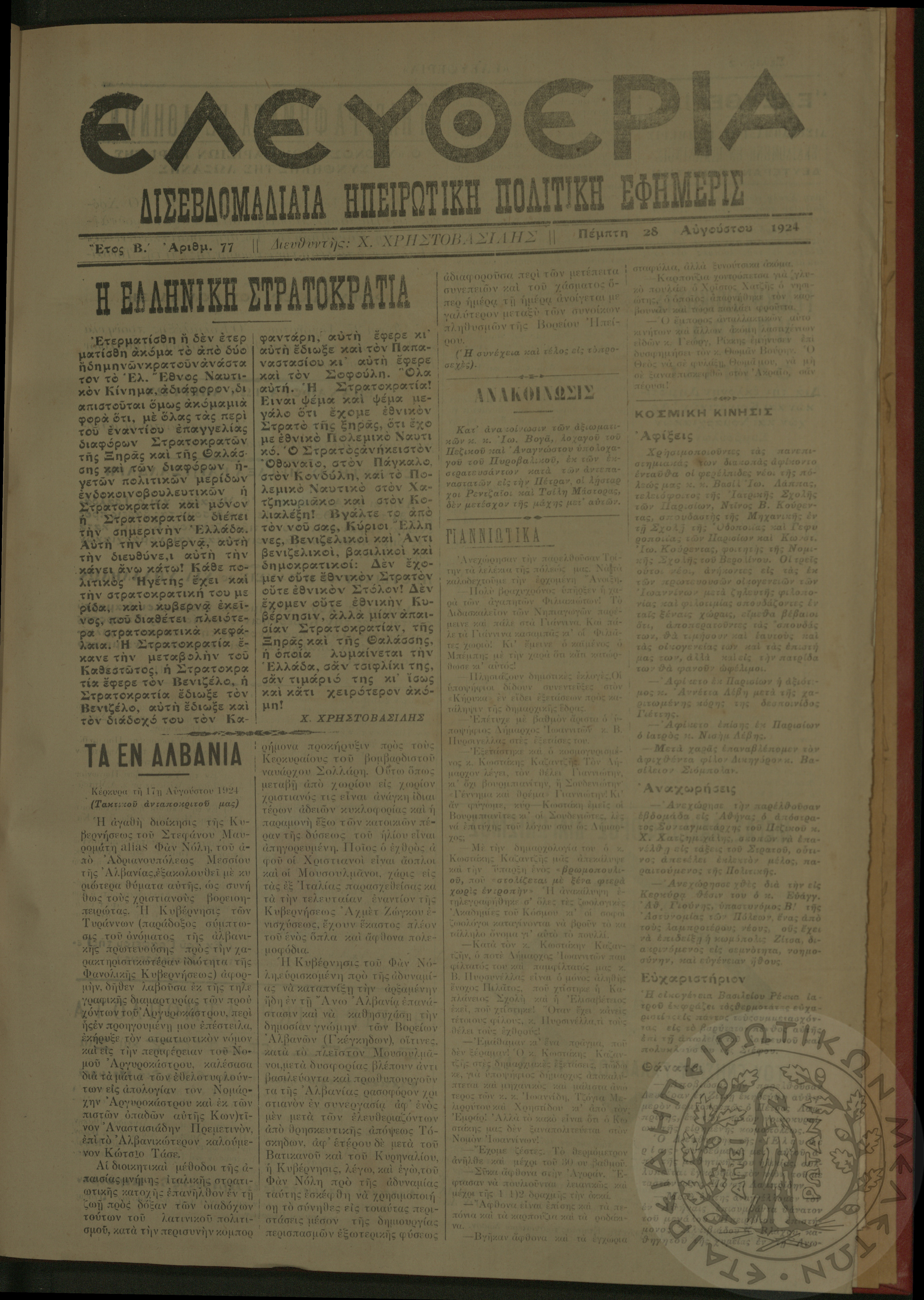 Ελευθερία: δισεβδομαδιαία Ηπειρωτική πολιτική εφημερίς, 1924, φ. 77