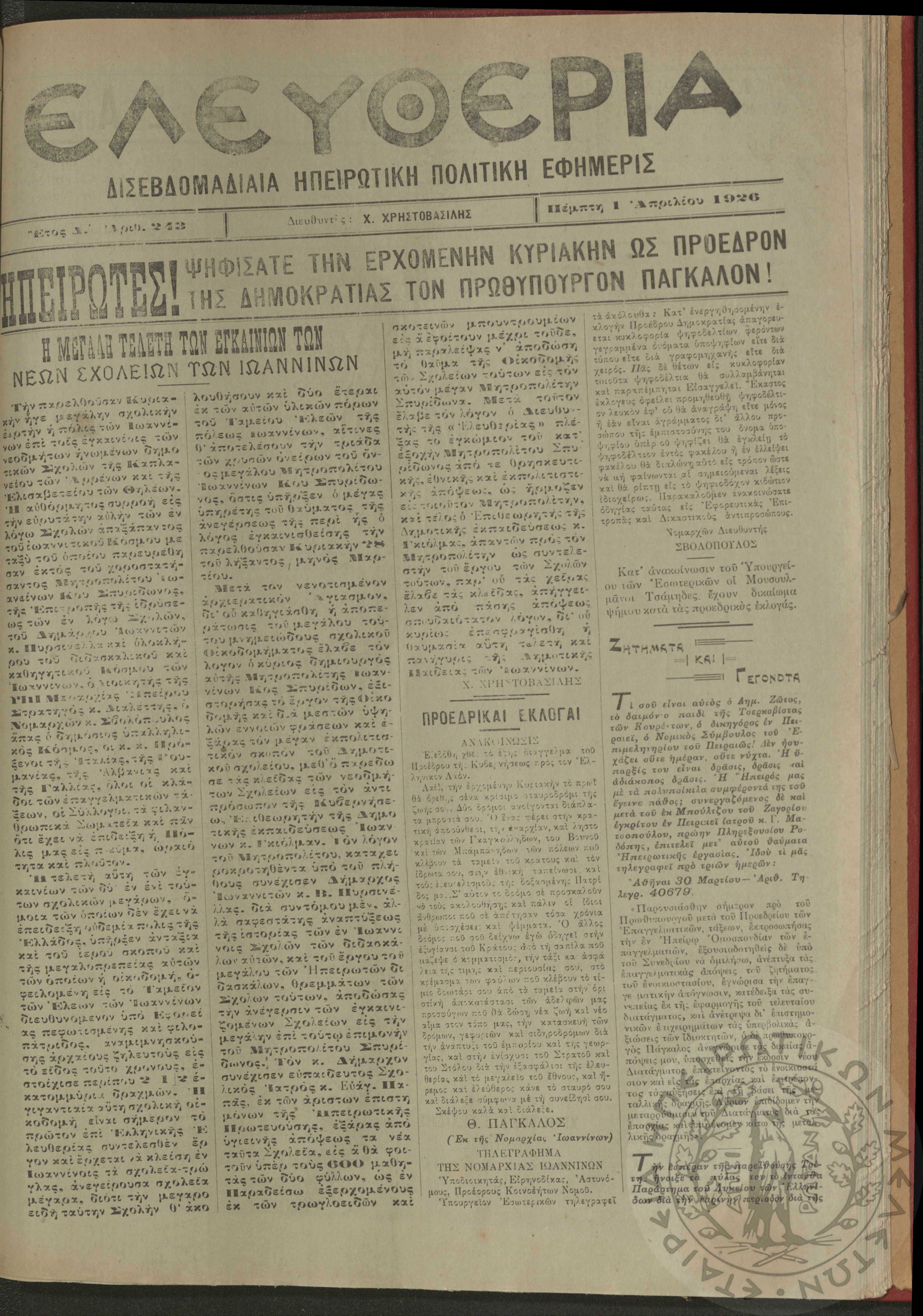 Ελευθερία: δισεβδομαδιαία Ηπειρωτική πολιτική εφημερίς, 1926, φ. 243